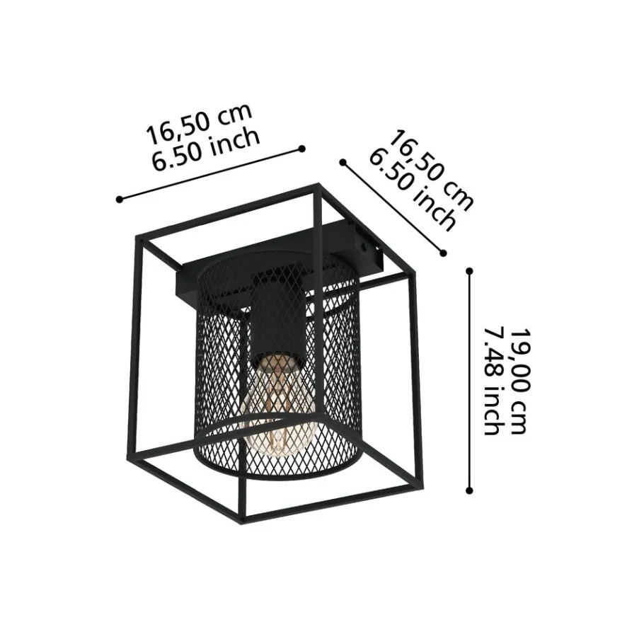 De plafondlamp CATTERICK bestaat uit een ronde, zwarte kap van draadraster, omgeven door een metalen frame. Het fijne gaas creëert een prachtig spel van licht en schaduw op de muur wanneer het licht wordt ingeschakeld. Het trendy industriële ontwerp van deze plafondlamp past perfect in vele interieurstijlen en zorgt voor moderne verlichting in elke ruimte, of het nu de woonkamer, slaapkamer, hal of eetkamer is. De lichtbron is niet inbegrepen. Het armatuur is compatibel met elke E27 lamp.