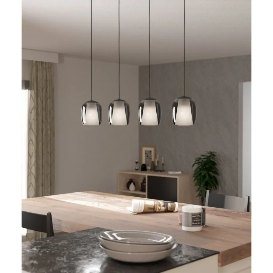 Deze CIAMPINO hanglamp is gemaakt van zwart staal, heeft lampkappen in zacht melkglas en heeft vier E27-lichtbronnen nodig om te schijnen (niet inclusief). Deze hanglamp zorgt voor een mooi lichtspel boven je eettafel.