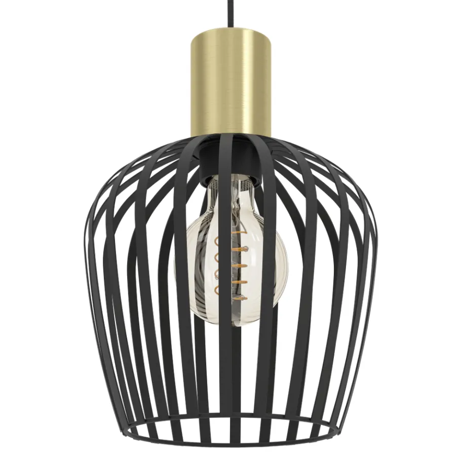 De stoere EMPOLI hanglamp met zwart stalen frame en fitting in messing geeft dé nodige touch aan je woning. Deze hanglamp is exclusief drie E27 lichtbronnen.