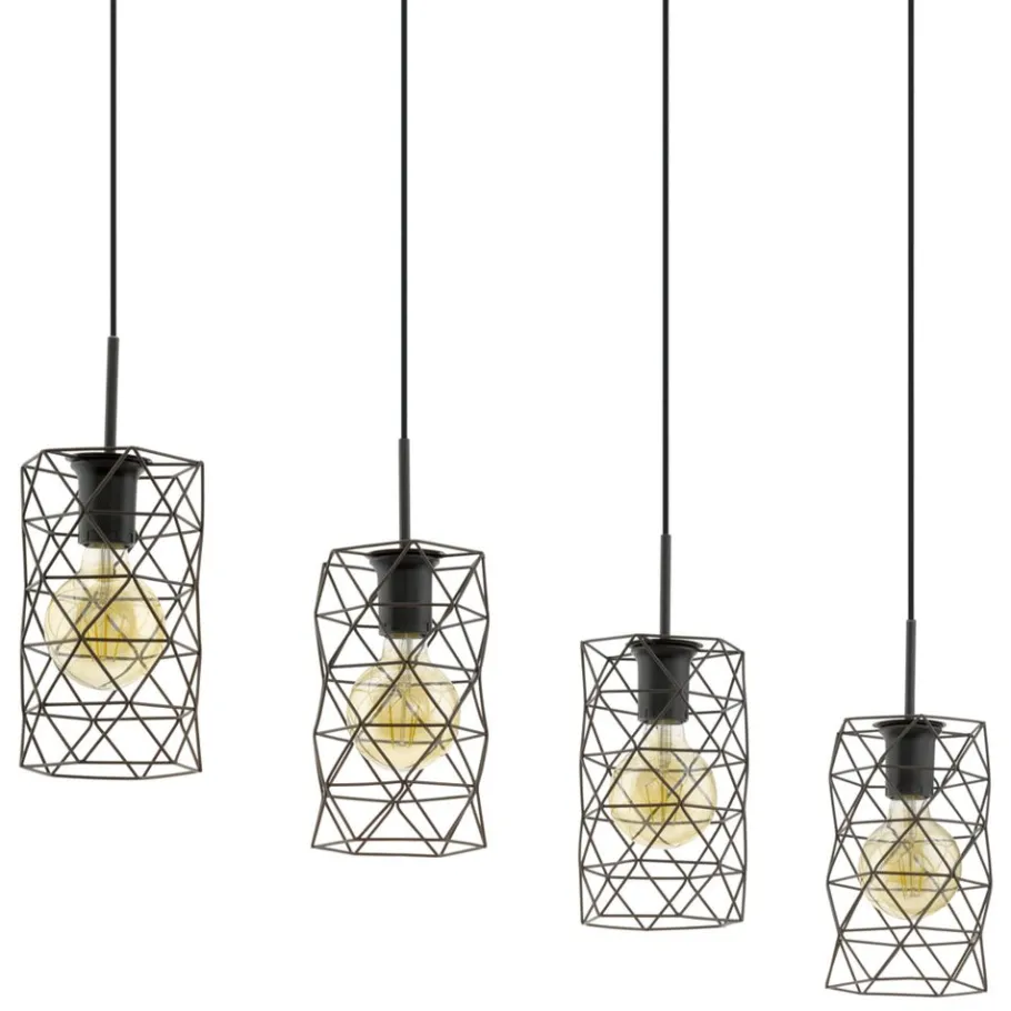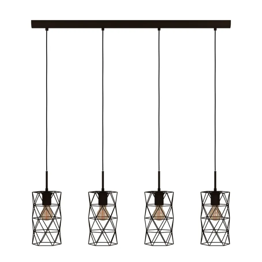 De ESTEVAU hanglamp bestaat uit vier donkerbruine draadkappen gecombineerd met een rechthoekige hanglamp van dezelfde kleur. Wanneer de geometrische tinten worden verlicht, creëren ze een fascinerend spel van licht en schaduw. Deze moderne hanglamp zorgt voor stijlvolle verlichting in de woonkamer of eetkamer, bijvoorbeeld boven een lange tafel. De afgebeelde lichtbronnen zijn niet inbegrepen. De armatuur is compatibel met elke E27 lamp.