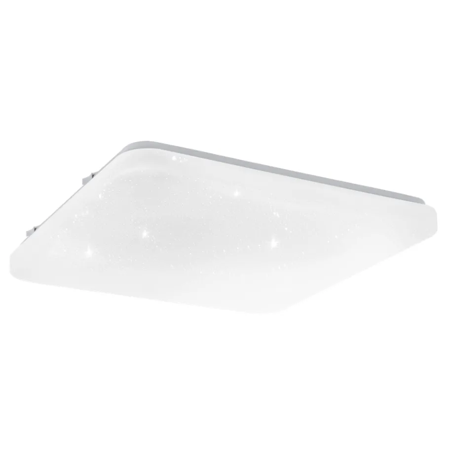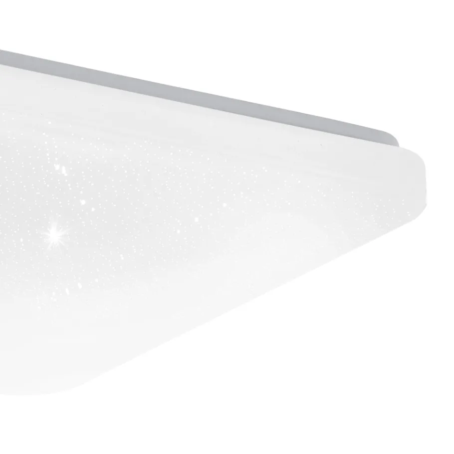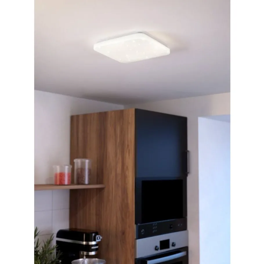 De LED-plafondlamp FRANIA-S bestaat uit een vierkant kunststof lichtvlak met afgeronde hoeken en een wit metalen achterzijde. Wanneer het licht wordt ingeschakeld, creëert de kap een glinsterend effect dat doet denken aan een sterrenhemel. De geïntegreerde LEDs geven een aangenaam warm wit licht. De plafondlamp van 33 x 33 cm zorgt voor warme verlichting en past perfect in moderne interieurs, bijvoorbeeld in de keuken, woonkamer, slaapkamer, hal of kinderkamer.
