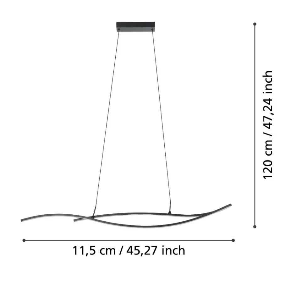Deze GRISOLIA hanglamp in zwart golfpatroon is onmisbaar in een modern interieur. Twee ledlijnen brengen met hun golvende vorm dynamiek in een moderne huiskamer en komt volledig tot zijn recht boven een lange tafel of keukeneiland. Deze hanglamp schijnt 2500 lumen en een witter licht van 4000 Kelvin, iets wat perfect in een strakke ruimte past.