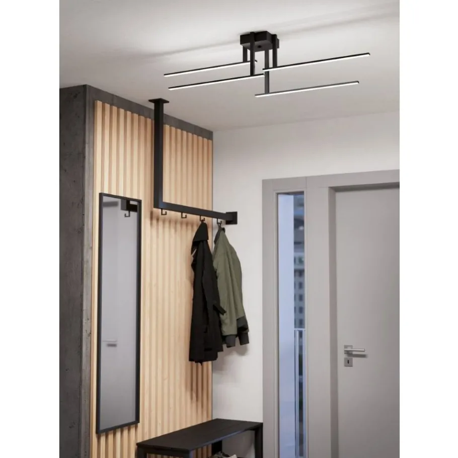 De IPOLITTO LED plafondlamp is gemaakt van zwart metaal met vier rechte LED staven. De achter de witte kunststof kappen geïntegreerde LEDs stralen een aangenaam warm wit licht uit. Dankzij het minimalistische ontwerp biedt het moderne verlichting in elke ruimte, of het nu de keuken, de woonkamer, de slaapkamer of de gang is.