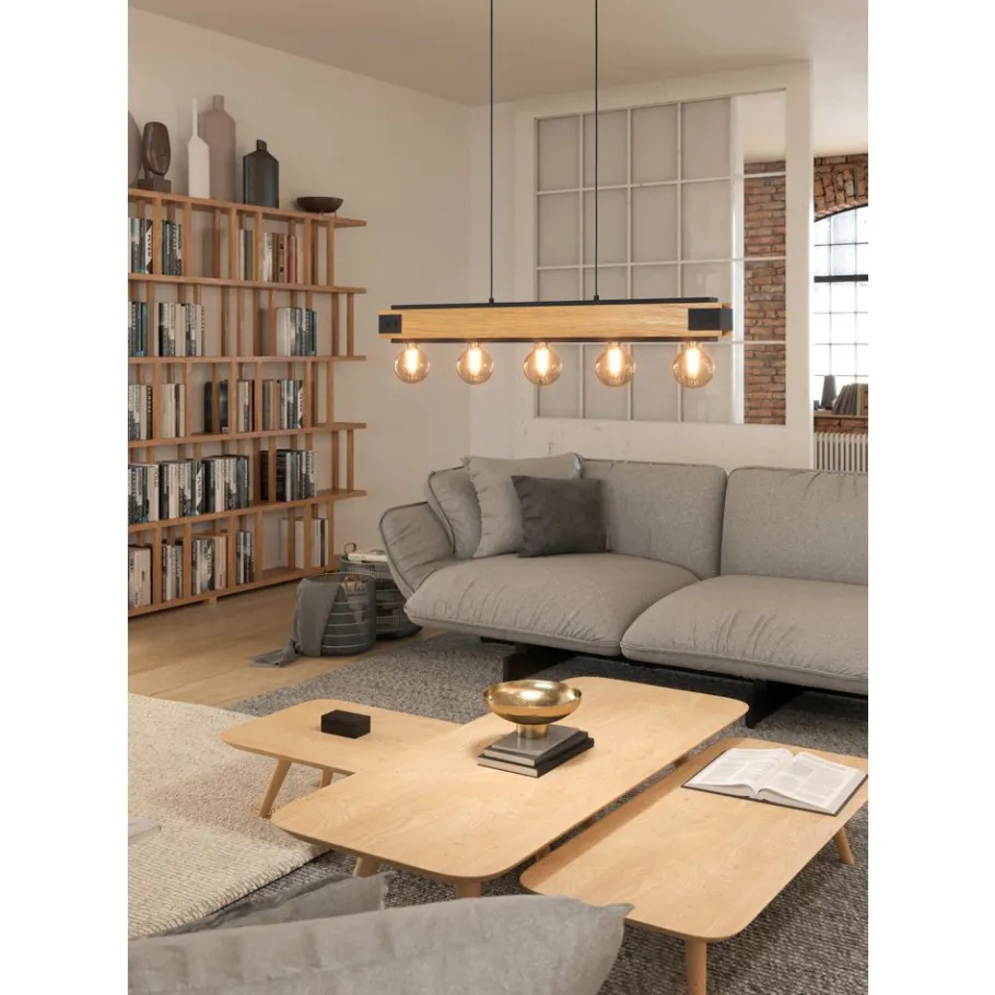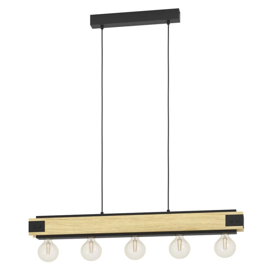 De hanglamp LAYHAM is gemaakt van zwart metaal met gevlamde houten zijkappen en vijf fittingen. Deze hanger past perfect in de vintage of industriële trend en biedt unieke, opvallende verlichting in elke kamer, of het nu de woonkamer is of de eetkamer, bijvoorbeeld boven een lange tafel. De afgebeelde lichtbronnen zijn niet inbegrepen. De armatuur is compatibel met elke E27 lamp.