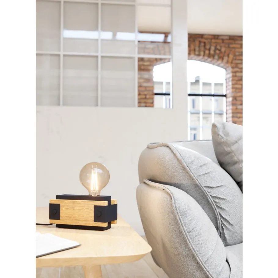 De LAYHAM tafellamp is gemaakt van zwart metaal met gevlamde houten zijkappen en een fitting. De kabelschakelaar maakt het aan- en uitschakelen gemakkelijk. De tafellamp past perfect in interieurs in vintage of industriële stijl. Het biedt unieke, opvallende verlichting in elke kamer, of het nu in de slaapkamer op het nachtkastje is, in de woonkamer, de eetkamer of de gang op een console. De afgebeelde lichtbron is niet inbegrepen. De armatuur is compatibel met elke E27 lamp.