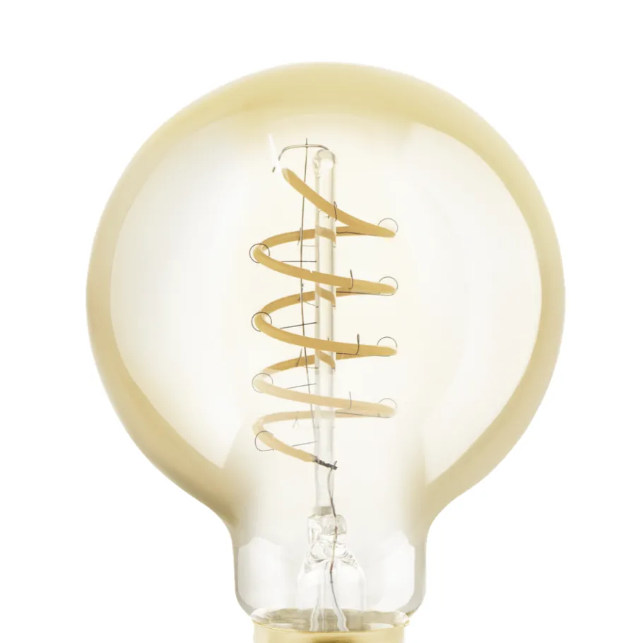 De E27 LED lichtbron is gemaakt van amberkleurig glas met spiraalvormige LEDs. De 4 Watt LED lamp (G80) geeft een aangenaam warm wit licht van 245 lumen en kan worden gedimd (afhankelijk van de dim eigenschappen van het armatuur). Dankzij het gouden effect in een trendy vintage design kan deze LED globe lamp ook perfect in het zicht hangen en zal ze een blikvanger zijn in elke kamer.