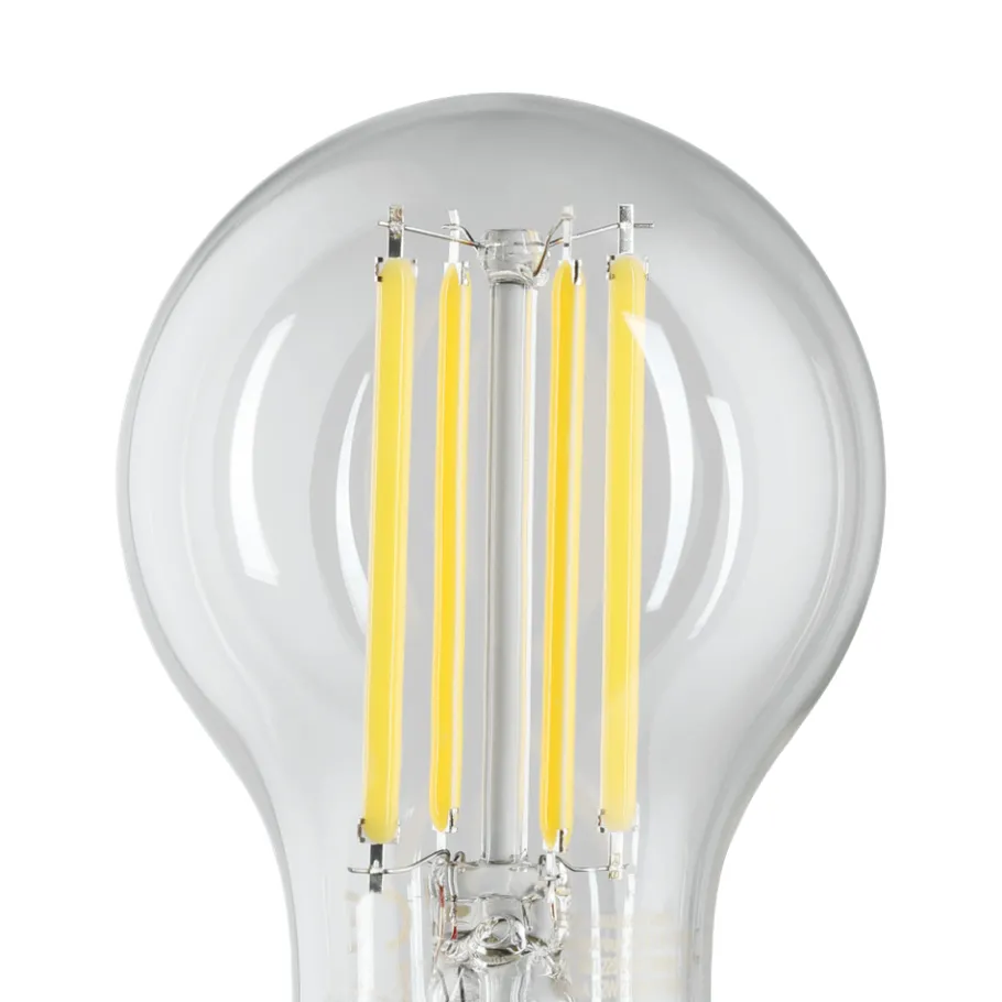 De E27 LED lamp met zichtbaar filament is gemaakt van helder glas. De klassieke 12 Watt LED lamp (A60) geeft een aangenaam warm wit licht van 1521 lumen.