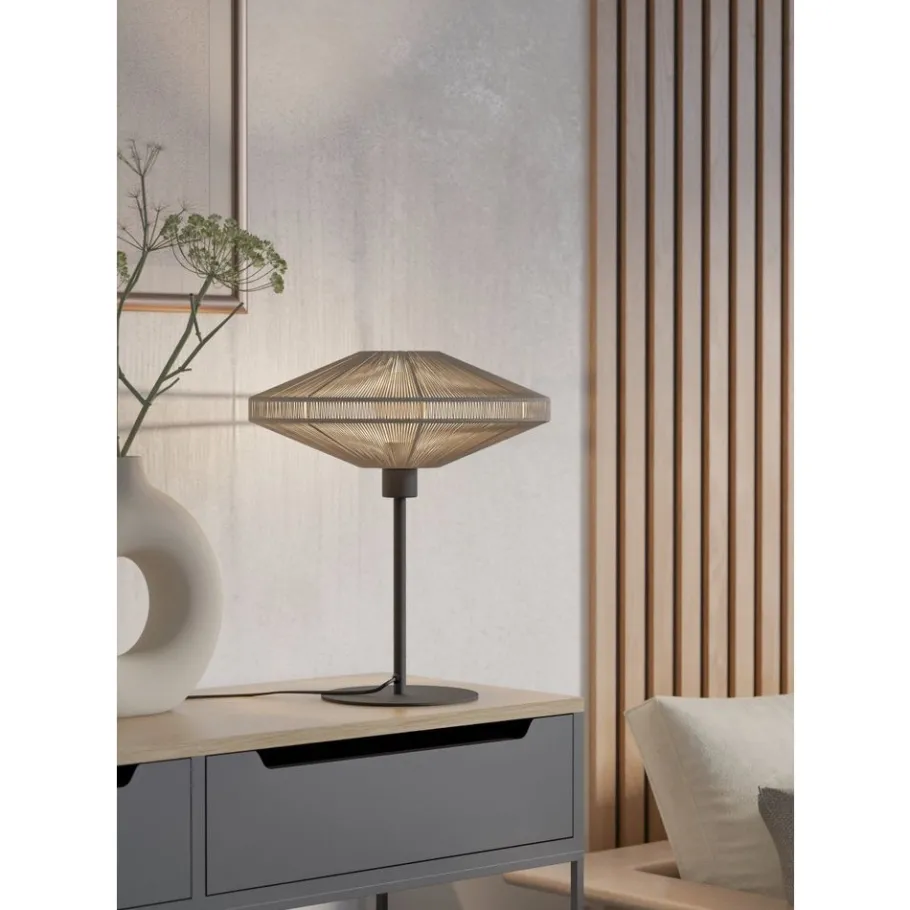 Deze MIDSUMER tafellamp is heeft een mat zwarte basis met een lampenkap in geweven ovalen vorm van stof. Dit armatuur heeft een E27-lichtbron nodig om te schijnen en is 44cm hoog.