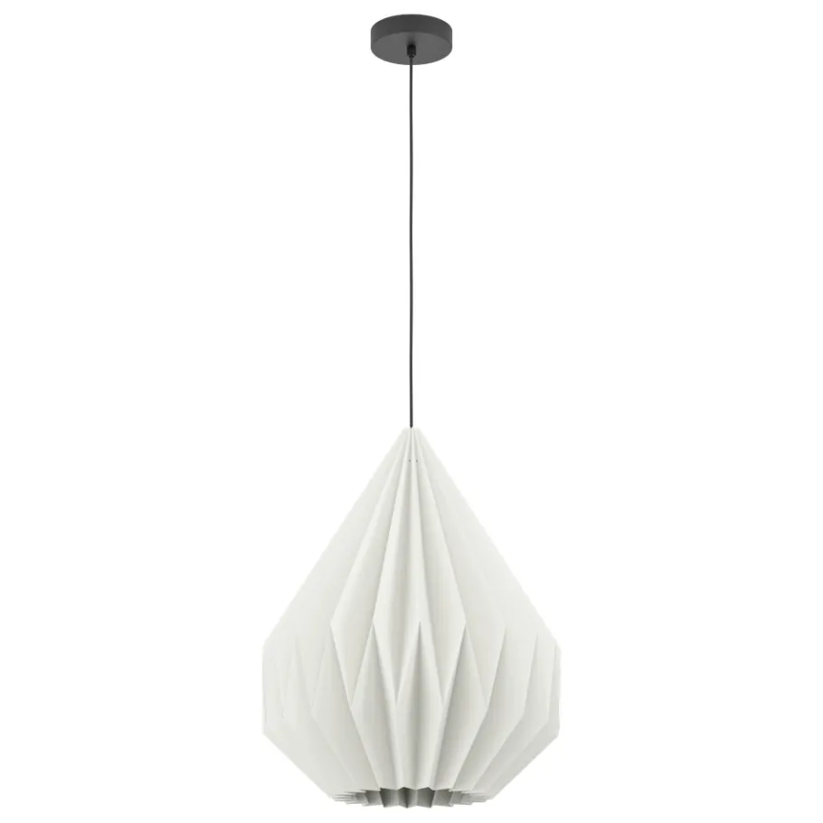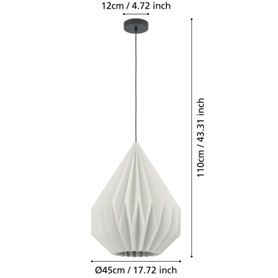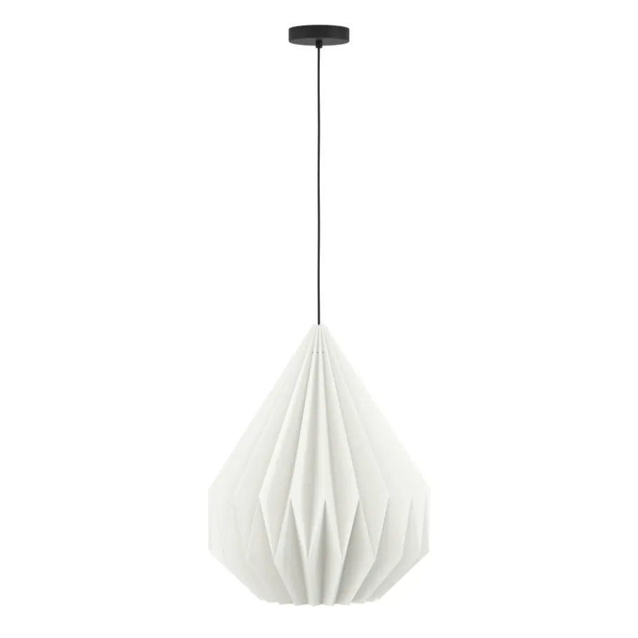 De hanglamp MINTING is gemaakt met een druppelvormige lampenkap van wit gevouwen papier en een zwarte metalen ophanging. De opening aan de onderkant van de papieren kap van 45 cm zorgt voor voldoende licht op het gebied eronder. De hanglamp past naadloos in moderne en Scandinavische interieurs en biedt stijlvolle verlichting voor elke ruimte – of het nu in de keuken, in de woonkamer of in de eetkamer boven de eettafel is. De lamp is niet bij de levering inbegrepen. De lamp is geschikt voor elke lamp met een E27 fitting.