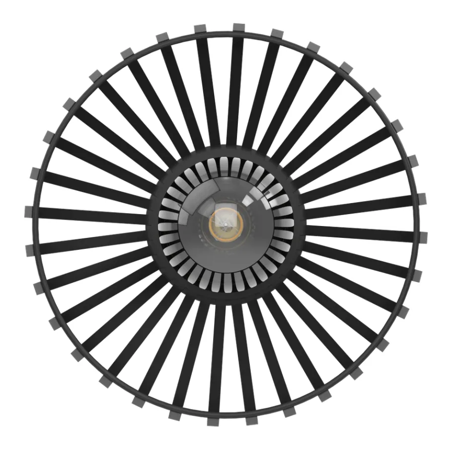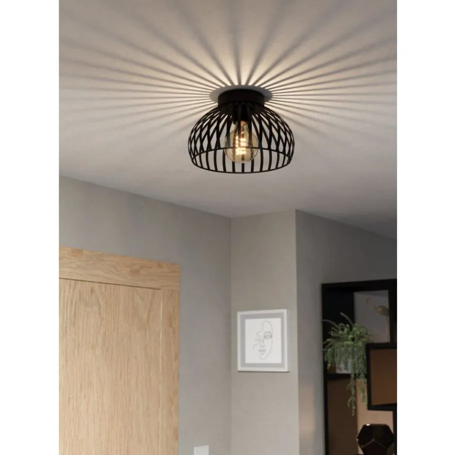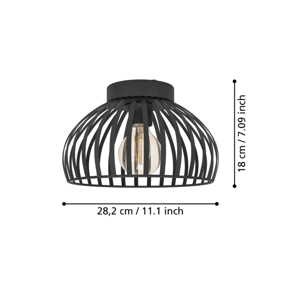 De Mogano plafondlamp is gemaakt met een ronde platte zwarte metalen kap. De platte metalen stutten zorgen voor fascinerende licht- en schaduweffecten wanneer ze worden verlicht. Het plafond met een diameter van 28 cm past met zijn monochrome design perfect in moderne installaties. Het biedt minimalistische verlichting voor elke ruimte – of het nu in de keuken, woonkamer, slaapkamer of hal is. De afgebeelde lichtbron wordt niet meegeleverd. De lamp is geschikt voor elke lichtbron met E27-fitting.