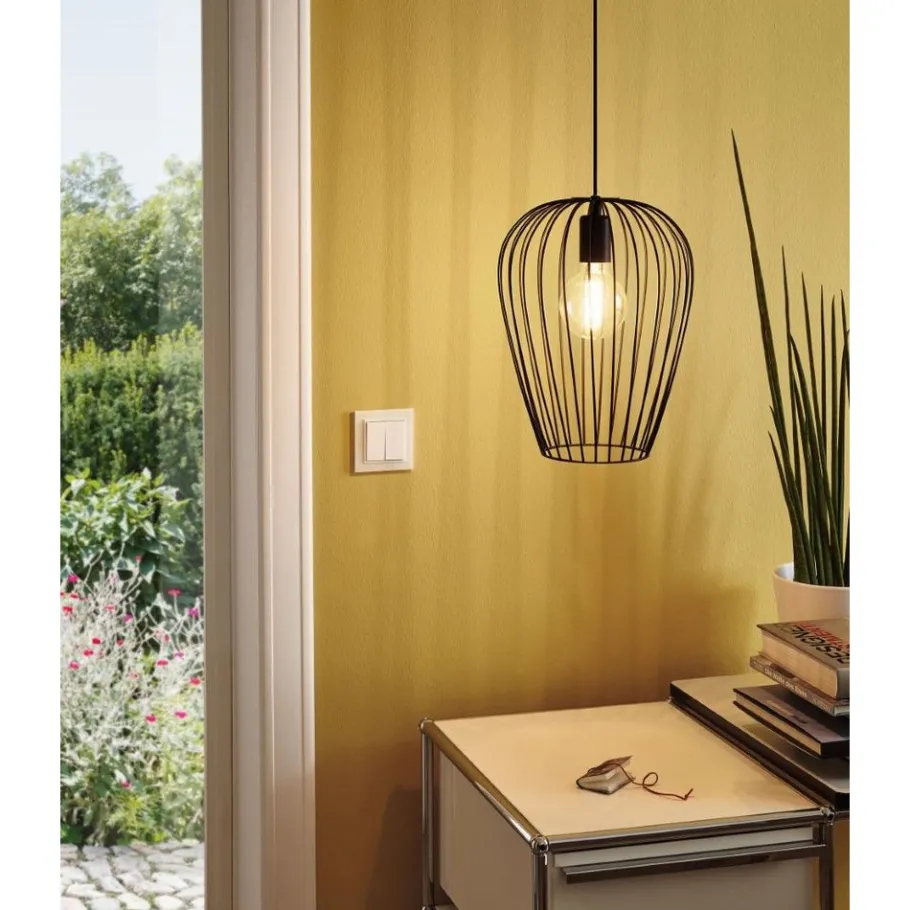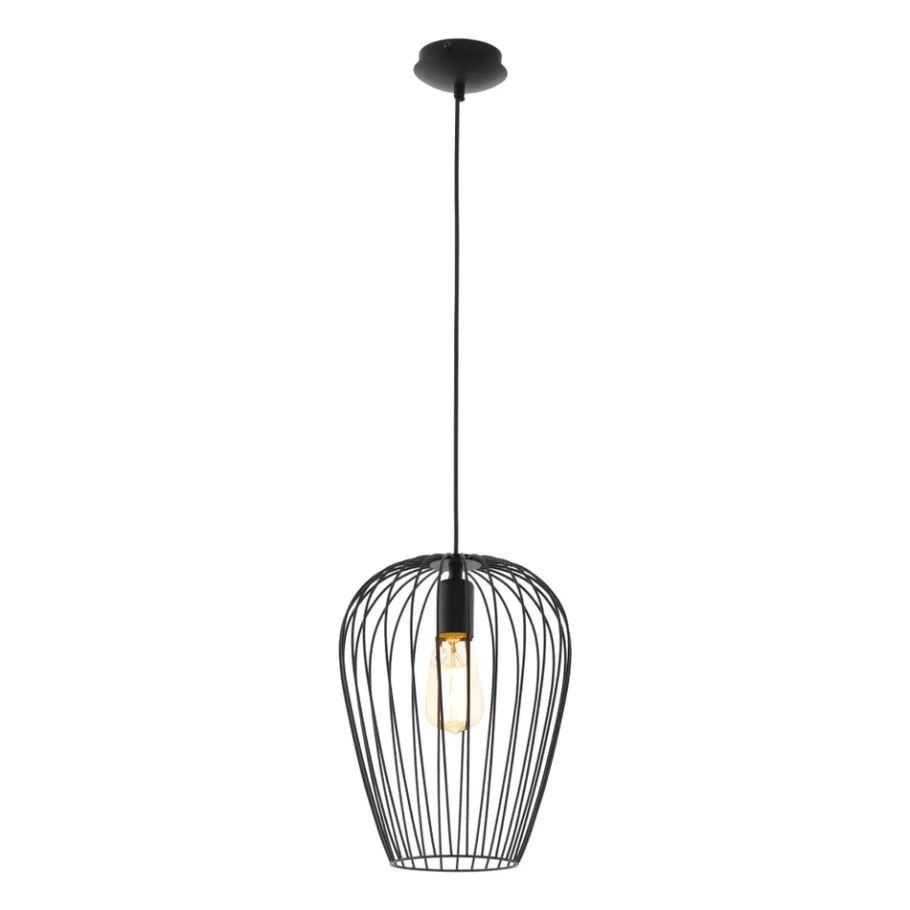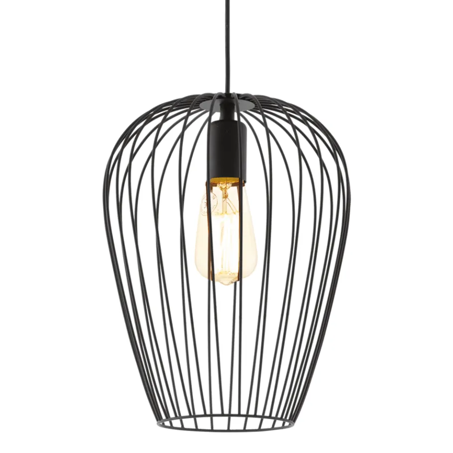 De NEWTOWN hanglamp bestaat uit een zwarte, ovale draadkap die aan een ronde zwart metalen kap hangt. De draadkap creëert een prachtig spel van licht en schaduw wanneer de lamp wordt ingeschakeld. De hanglamp past perfect in moderne interieurs en zorgt voor warme verlichting in de woonkamer of eetkamer. De afgebeelde lichtbron is niet inbegrepen. De armatuur is compatibel met elke E27 lamp.