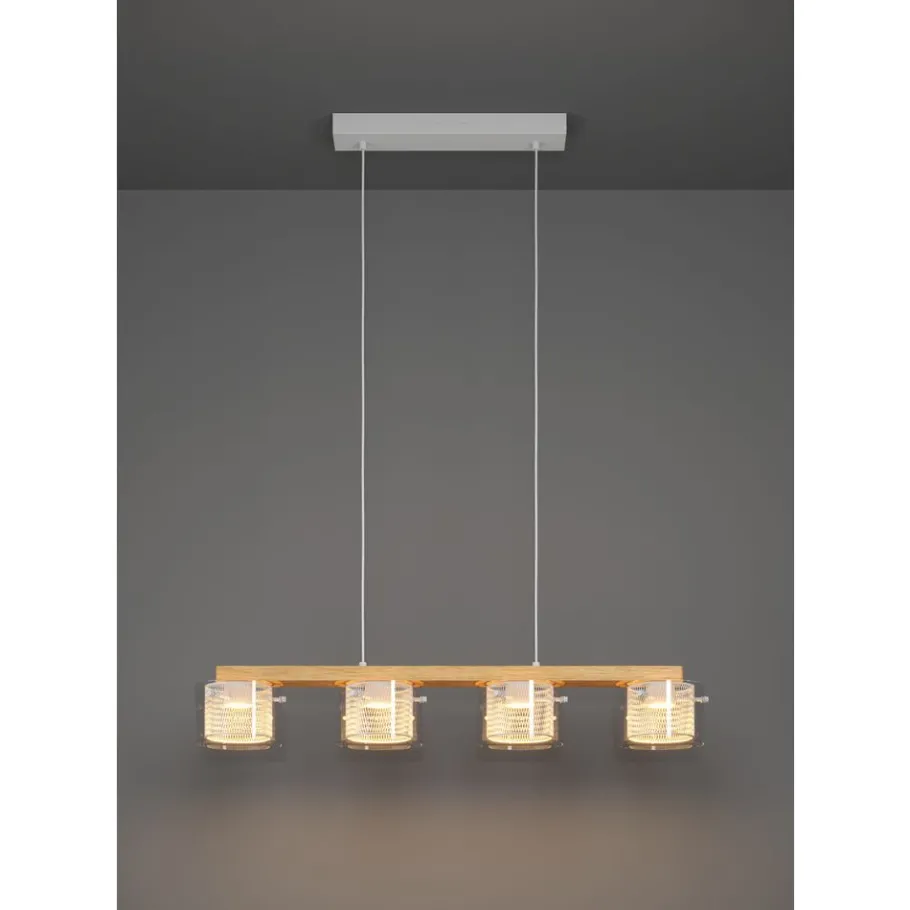 De LED hanglamp PORTICO-Z maakt deel uit van de connect.z productlijn. De hanglamp heeft een houten behuizing met vier glazen lampenkappen, elk met een stalen gaascilinder erin. De geïntegreerde LED’s produceren een regelbaar licht dat naar wens kan worden aangepast. Je kunt kiezen uit warm wit, neutraal wit en koel wit licht, en een breed scala aan RGB-kleuren. Het licht kan worden bediend met een gratis app (AwoX HomeControl), die ook andere functies biedt zoals helderheidsaanpassing, timerbediening, aanwezigheidssimulatie en nog veel meer. Het product maakt gebruik van Bluetooth en ZigBee 3.0 en kan ook worden bediend met compatibele spraakassistenten. De hanglamp kan ook bediend worden met een afstandsbediening, die apart verkrijgbaar is. Met een modern ontwerp past de lamp naadloos in verschillende interieurstijlen en biedt stijlvolle verlichting voor elke ruimte, of het nu in de woonkamer is of boven de eetkamertafel.