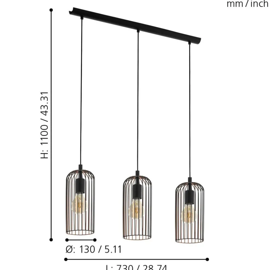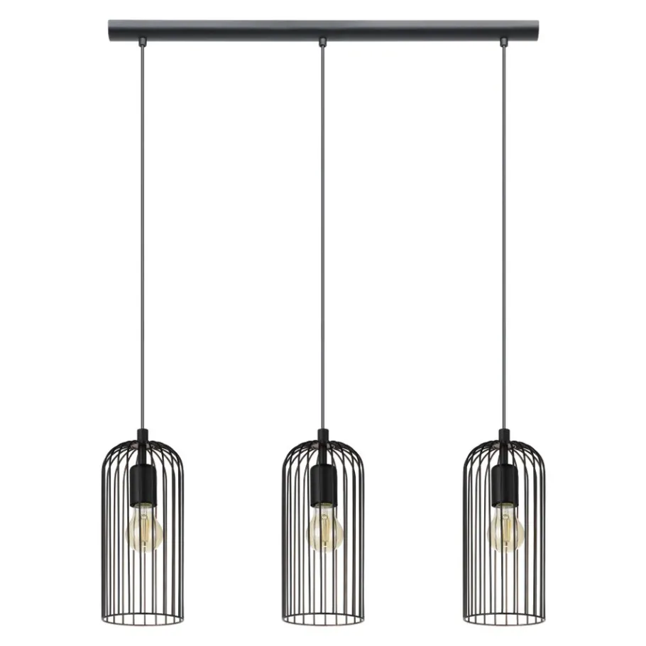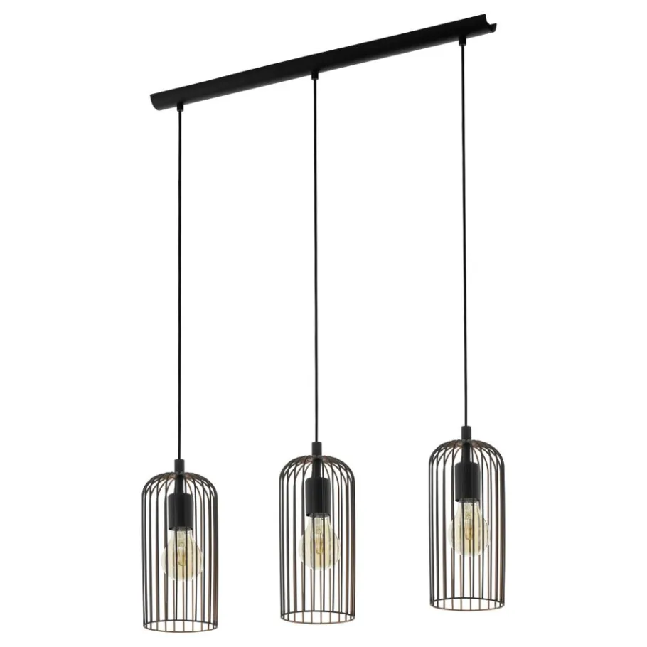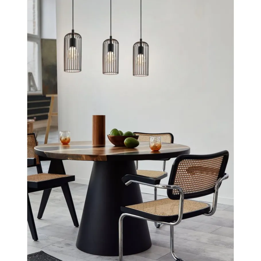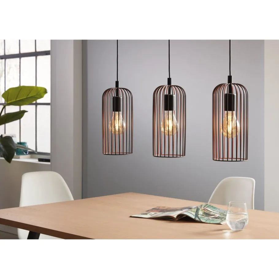De ROCCAMENA hanglamp bestaat uit drie draadkappen die met hun zwarte buitenkant en koperen binnenkant een uniek visueel effect creëren. De armatuur is gecombineerd met een rechthoekige kap van zwart metaal. De kappen creëren een prachtig spel van licht en schaduw wanneer het armatuur wordt ingeschakeld. De hanglamp past perfect in moderne interieurs en zorgt voor warme verlichting in de woonkamer of eetkamer boven de tafel. De afgebeelde lichtbronnen zijn niet inbegrepen. De armatuur is compatibel met elke E27 lamp.