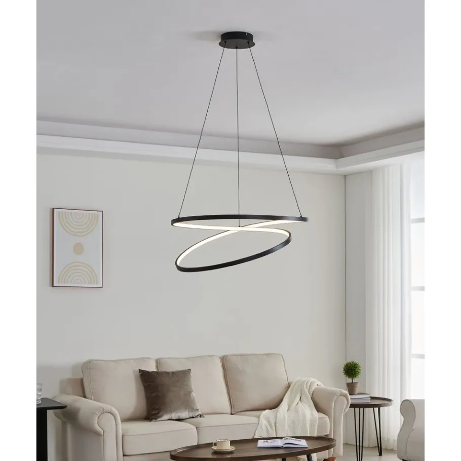 De RUOTALE LED hanglamp bestaat uit een harmonische ronde LED-balk van zwart metaal met een wit kunststof verlichtingsoppervlak aan de binnenkant. De staaf is door middel van drie metalen kabels opgehangen aan een ronde zwarte metalen kap. De geïntegreerde LEDs stralen een indirect warm wit licht uit. De ophanging past perfect in moderne interieurs en is een blikvanger in de woonkamer of eetkamer boven de tafel.