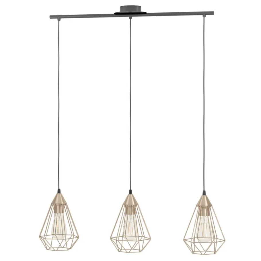 De TARBES hanglamp bestaat uit drie koperkleurige draadkappen in de vorm van een diamant, gecombineerd met een zwarte rechthoekige hanglamp. Wanneer de geometrische tinten worden verlicht, creëren ze een fascinerend spel van licht en schaduw. Deze moderne hanglamp zorgt voor stijlvolle verlichting in elke ruimte, zowel in de woonkamer als in de eetkamer, bijvoorbeeld boven een lange tafel. De afgebeelde lichtbronnen zijn niet inbegrepen. De armatuur is compatibel met elke E27 lamp.