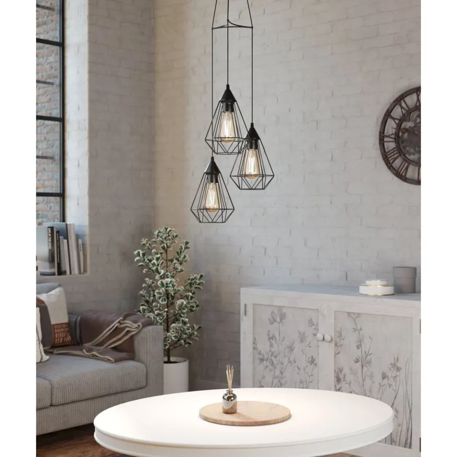 De TARBES hanglamp bestaat uit drie zwarte, ruitvormige draadkappen die op verschillende hoogten aan een ronde kap van dezelfde kleur hangen. Wanneer de geometrische tinten worden verlicht, creëren ze een fascinerend spel van licht en schaduw. Deze moderne hanglamp zorgt voor stijlvolle verlichting in elke kamer, of het nu de woonkamer of de eetkamer is. De afgebeelde lichtbronnen zijn niet inbegrepen. De armatuur is compatibel met elke E27 lamp.