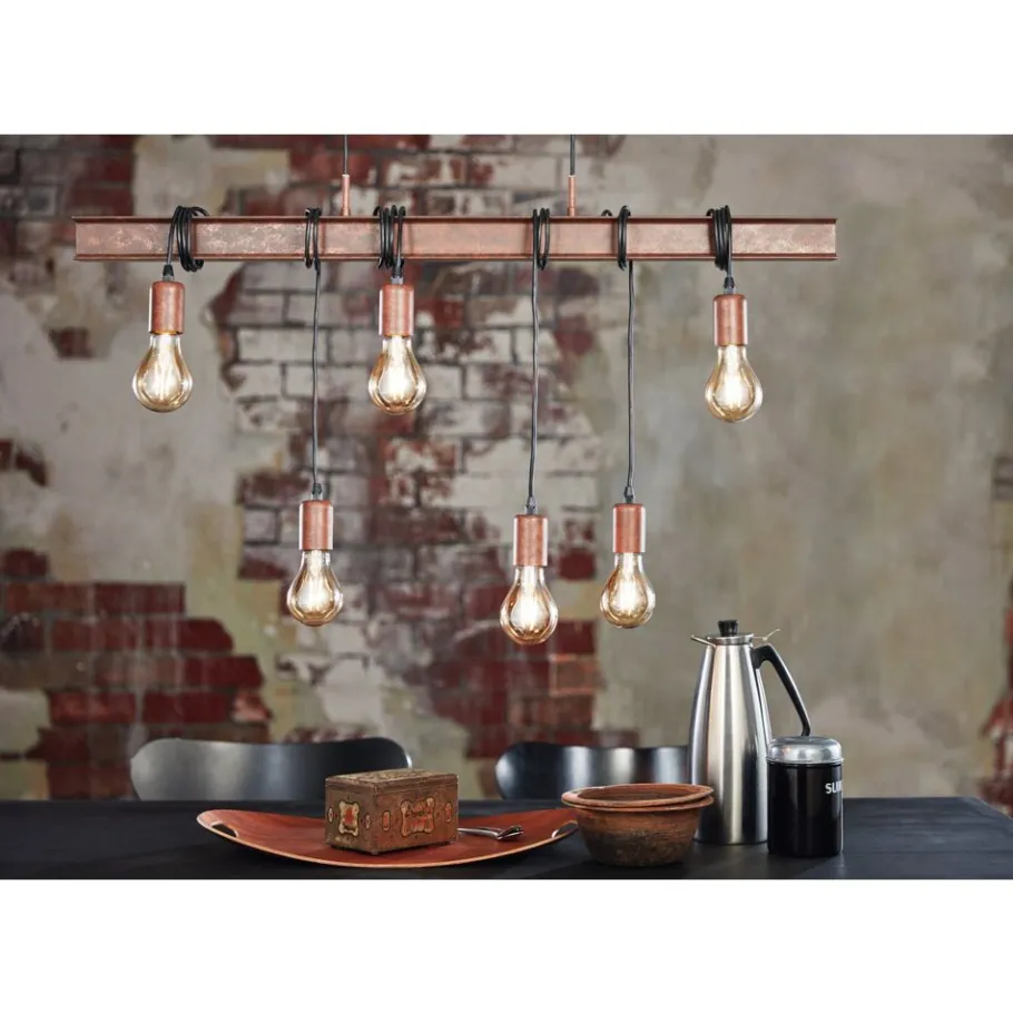 De TOWNSHEND 4 bestaat uit een roestbruine metalen staaf die lijkt op een stalen balk. De metalen staaf is gecombineerd met zes roestbruine hangmoffen, waarvan de hoogte kan worden aangepast door eenvoudigweg de kabel op te winden. De hanglamp past perfect in interieurs in vintage of industriële stijl. Het is een blikvanger in elke kamer, zowel in de woonkamer als in de eetkamer, bijvoorbeeld boven een lange tafel. De afgebeelde lichtbronnen zijn niet inbegrepen. De armatuur is compatibel met elke E27 lamp.