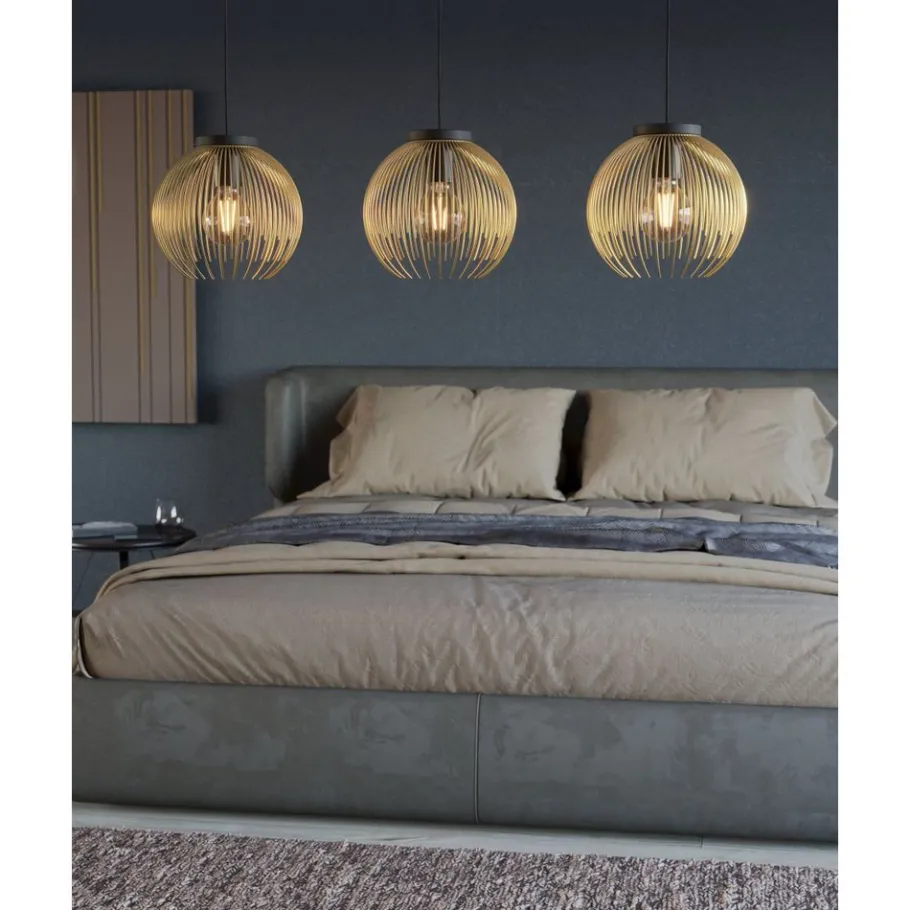 De hanglamp VENEZUELA bestaat uit drie gouden draadkappen die met zwarte textielkabels aan een ronde zwarte metalen kap zijn opgehangen. De draadkappen omsluiten met hun harmonieuze rondheid de lampen die zich in elk van hen bevinden, waardoor een fascinerend spel van licht en schaduw ontstaat zodra het armatuur wordt ingeschakeld. Deze hanglamp geeft de finishing touch aan een modern interieur en zorgt voor stijlvolle verlichting in de woonkamer of in de eetkamer boven de tafel. De afgebeelde lichtbronnen zijn niet inbegrepen. De lamp is compatibel met elke E27 lamp.