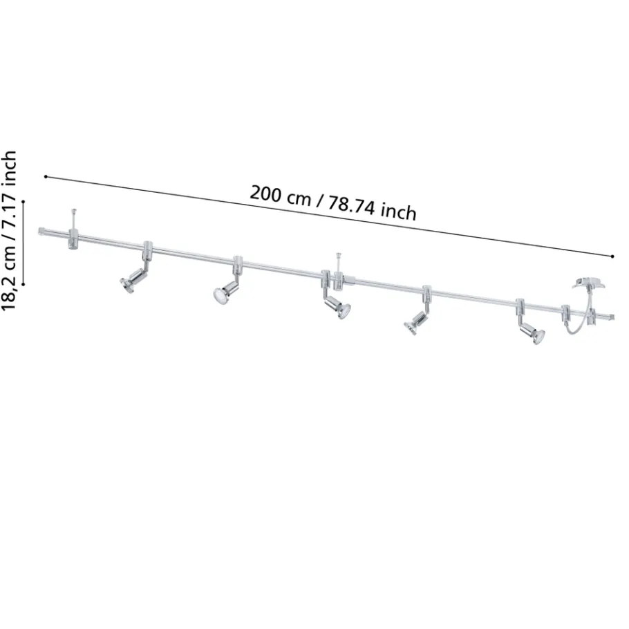 De LED-plafondlamp VILANOVA bestaat uit een aluminium rail die door drie steunen aan het plafond wordt bevestigd. De armatuur is gecombineerd met vijf verplaatsbare verchroomde metalen spots die flexibel op de rail kunnen worden geplaatst. Deze tijdloze plafondlamp geeft de finishing touch aan een modern interieur en zorgt voor gerichte verlichting, of het nu in de keuken, woonkamer, slaapkamer, eetkamer of hal is. De afgebeelde GU10 lampen zijn inbegrepen en geven een aangenaam warm wit licht.