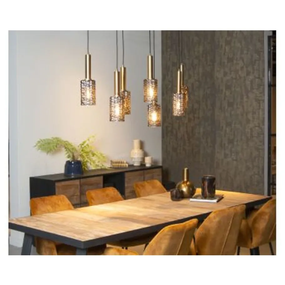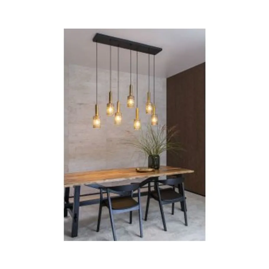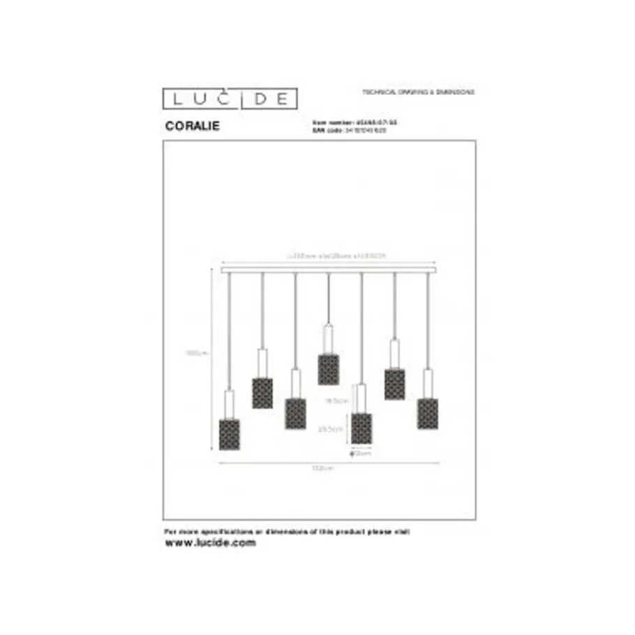 Zeven is een getal van perfectie. En dat weet Coralie als geen ander. Vanuit een verfijnde metalen plafondplaat vertrekken 7 lichtpunten, elk in hoogte verstelbaar van 50 tot 150 centimeter. Zo kan je zelf variëren in lengtes en een uniform of speels effect creëren. Deze hanglamp is een klassieker door de structuur op het glas. Door de gebruikte materialen krijgt de luchter meteen ook een moderne toets. Sluit Coralie aan op een dimmer en geniet van gezellige etentjes in haar gezelschap.