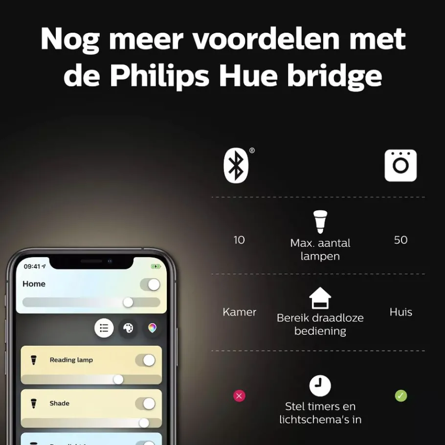 Voeg een Hue Bridge (afzonderlijk verkrijgbaar) toe aan uw slimme LED-lampen en ervaar alle mogelijkheden van Philips Hue. Met een Hue Bridge kunt u tot maar liefst 50 lampen toevoegen om in uw hele huis het perfecte licht in te stellen. Stel routines in om alle slimme verlichting in het huis te automatiseren. Bedien uw lampen ook als u niet thuis bent of voeg accessoires toe, zoals bewegingssensoren en slimme schakelaars.