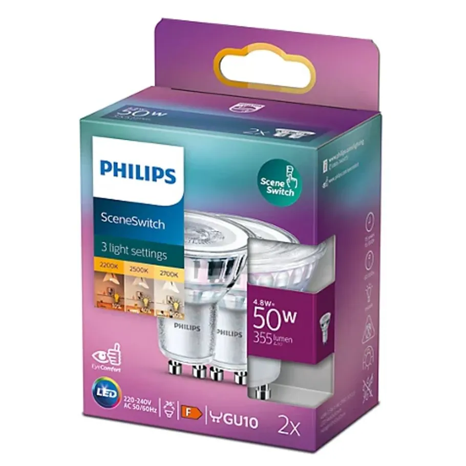 Creëer de perfecte sfeer voor elk moment. Met de Philips SceneSwitch LED-lamp kun je met jouw bestaande schakelaar eenvoudig het lichtniveau aanpassen, van helder licht naar natuurlijk licht of een sfeervolle, warme gloed