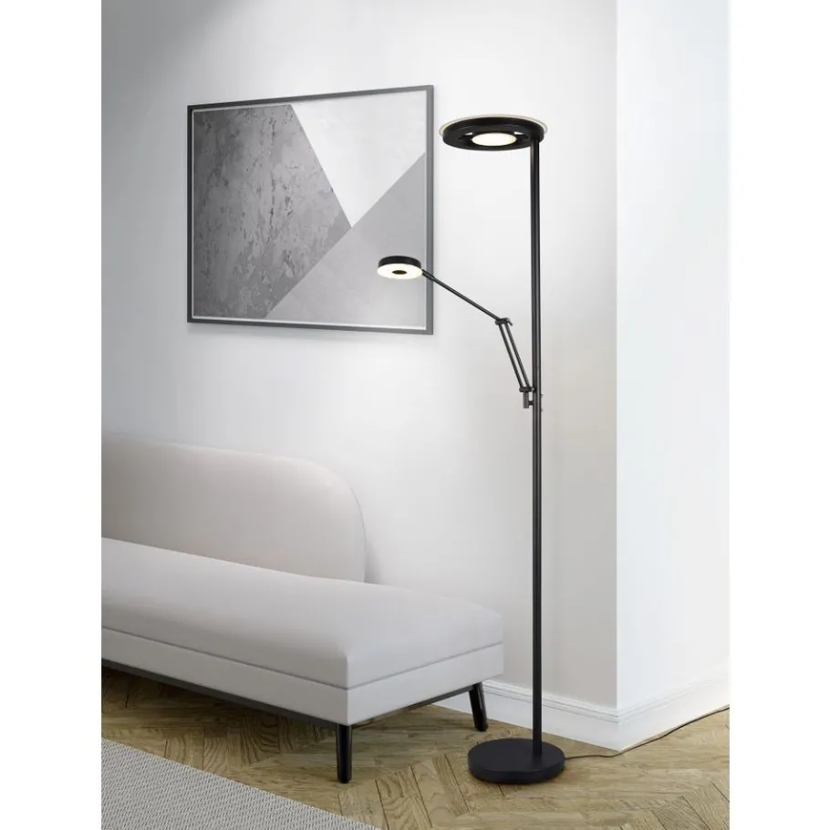 De moderne schijnwerper BARRIE overtuigt met zijn vele praktische functies. Via twee aparte aanraakpunten kunnen zowel de hoofdlichtbron als de leeslamp onafhankelijk van elkaar bediend worden. Daarnaast kunnen de lichtkleur en de helderheid van beide lichtbronnen individueel via de aanraakpunten aangepast worden. Door de geïntegreerde geheugenfunctie wordt het laatst ingestelde lichtscenario automatisch weer ingesteld. Bij de hoofdlichtbron is het binnenste licht zwenkbaar, zodat de lichtinval ook naar boven gericht kan worden. De leesarm kan flexibel aan twee punten versteld worden, zodat ook de positie vrij gekozen kan worden. Dankzij het moderne kleurschema in zwart kan de lamp met vele inrichtingsstijlen gecombineerd worden. Daarnaast beschikt de lamp over een moderne ledtechnologie die zich onderscheidt met een hoge lichtkwaliteit en energie-efficiëntie. In vergelijking met gewone halogeenlampen kan tot 80% bespaard worden op de energiekosten. Bovendien hebben ledlampen een lange levensduur, produceren minder warmte en zijn milieuvriendelijk.