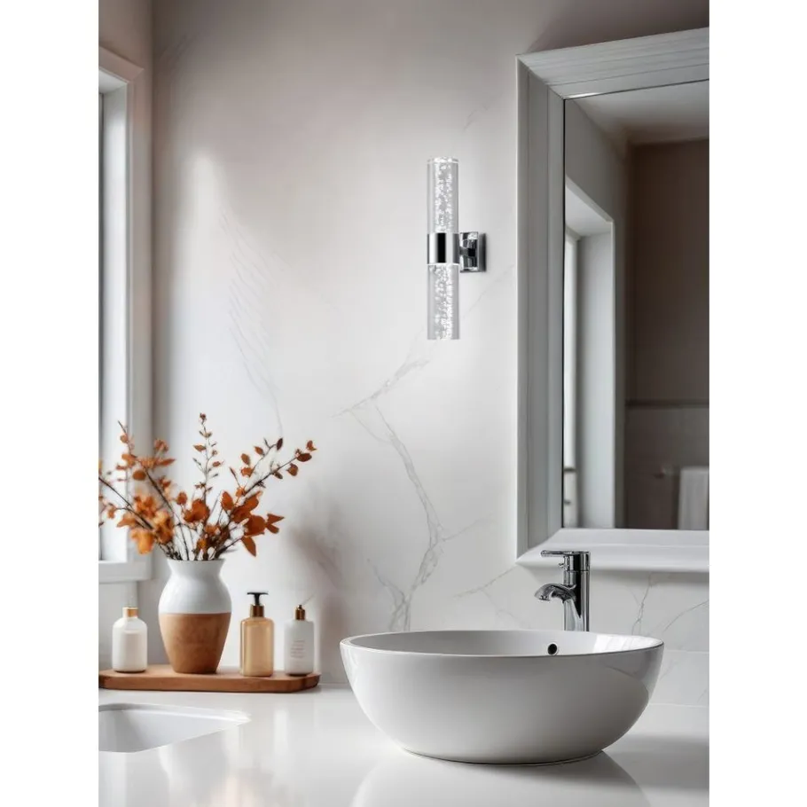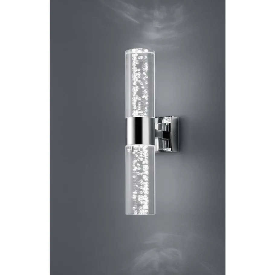 De BOLSA wandlamp is een blikvanger in elke badkamer! Dankzij de vorm in combinatie met de bubbellook ziet deze up- en downlight eruit als een bijzonder designerstuk. Dankzij de IP44-beschermingsgraad is hij ideaal voor vochtige ruimtes en verfraait hij ook het uiterlijk ervan. De lamp heeft een hoogte van 30 cm en een breedte van 7 cm. De chroomkleur geeft het armatuur een glanzende uitstraling, die wordt afgerond door het decoratieve glas. Daarnaast beschikt de lamp over een moderne ledtechnologie die zich onderscheidt met een hoge lichtkwaliteit en energie-efficiëntie. In vergelijking met gewone halogeenlampen kan tot 80% bespaard worden op de energiekosten. Bovendien hebben ledlampen een lange levensduur, produceren minder warmte en zijn milieuvriendelijk.