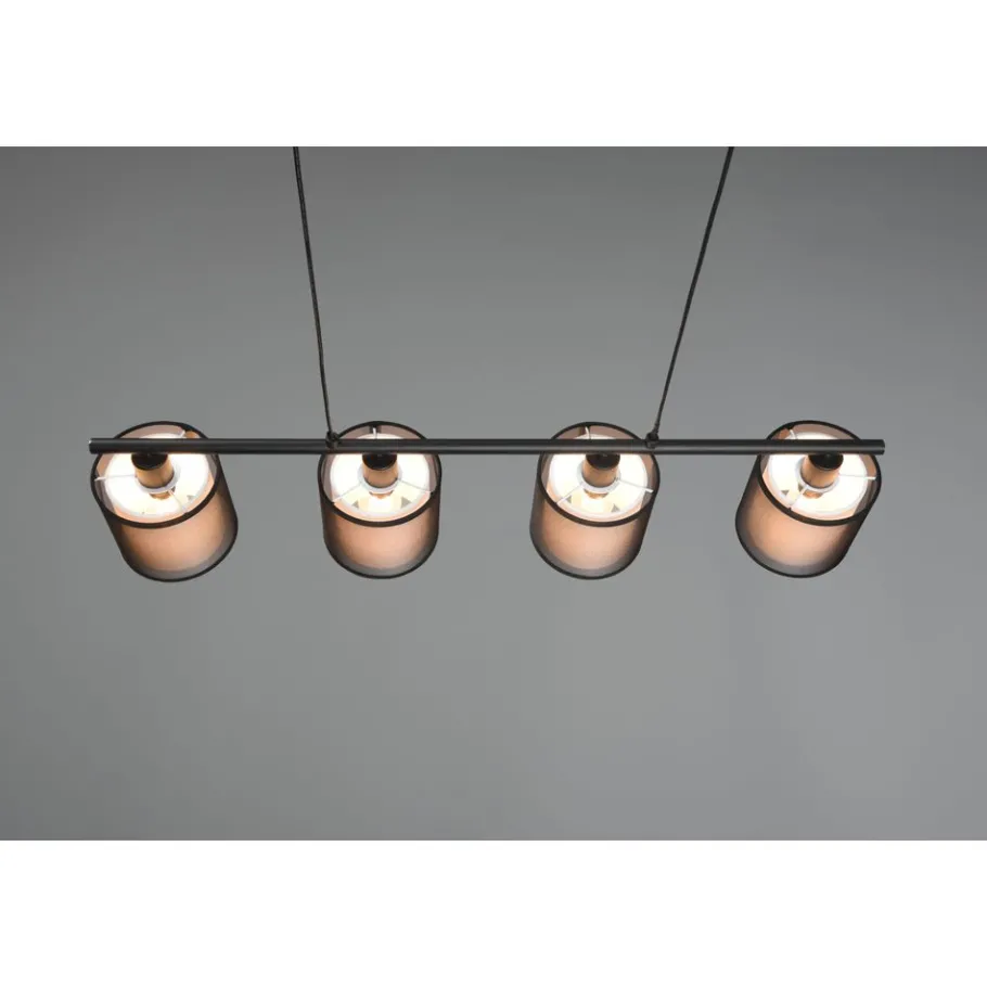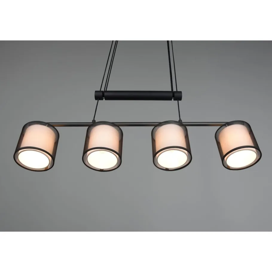 Met hun stoffen kappen zijn de lampen van de serie BURTON het toonbeeld van behaaglijkheid. Het huiselijke licht van de viervlammige hanglamp, die met de twee verschillend gekleurde kappen een gezellige sfeer schept, zet bijzondere lichtaccenten. De lamp kan ook variabel in de hoogte worden versteld en past zich optimaal aan uw behoeften aan. De moderne combinatie van een witte stoffen binnenkap en een transparante zwarte kunststof buitenkap werkt individueel en verfrissend en kan op verschillende manieren in moderne woonstijlen worden geïntegreerd. Voor een energiebesparende verlichting is het gebruik van een ledlichtbron aanbevolen. Deze zijn een optimaal alternatief voor gewone halogeenlampen en staan voor een hoge lichtkwaliteit en een energiebesparing van tot 80%. Bovendien profiteert u bij ledlichtbronnen van een lange levensduur, een geringe warmteontwikkeling en spaart tegelijkertijd het milieu.