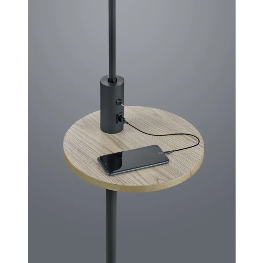 De moderne CLAAS vloerlamp is perfect om in de gang of naast de bank te plaatsen en creëert lichtaccenten die je woonruimte een gezellige sfeer geven. De vloerlamp heeft ook een klein houten tafeltje en een USB-poort met oplaadfunctie, waardoor hij ideaal is om bijvoorbeeld je mobiele telefoon naast de bank te leggen en tegelijkertijd op te laden. De praktische lamp is 160 cm hoog en heeft een projectie van 40 cm. De combinatie van matzwart en de grijze stoffen kap, samen met de houten tafel, geeft de lamp een moderne uitstraling. Het gebruik van LED lichtbronnen wordt aanbevolen voor energiebesparende verlichting. Deze vormen een ideaal alternatief voor conventionele halogeenlichtbronnen en bieden een hoge lichtkwaliteit en energiebesparingen tot 80%. Met LED lichtbronnen profiteert u ook van een lange levensduur en een lage warmteontwikkeling, terwijl het milieu wordt beschermd.