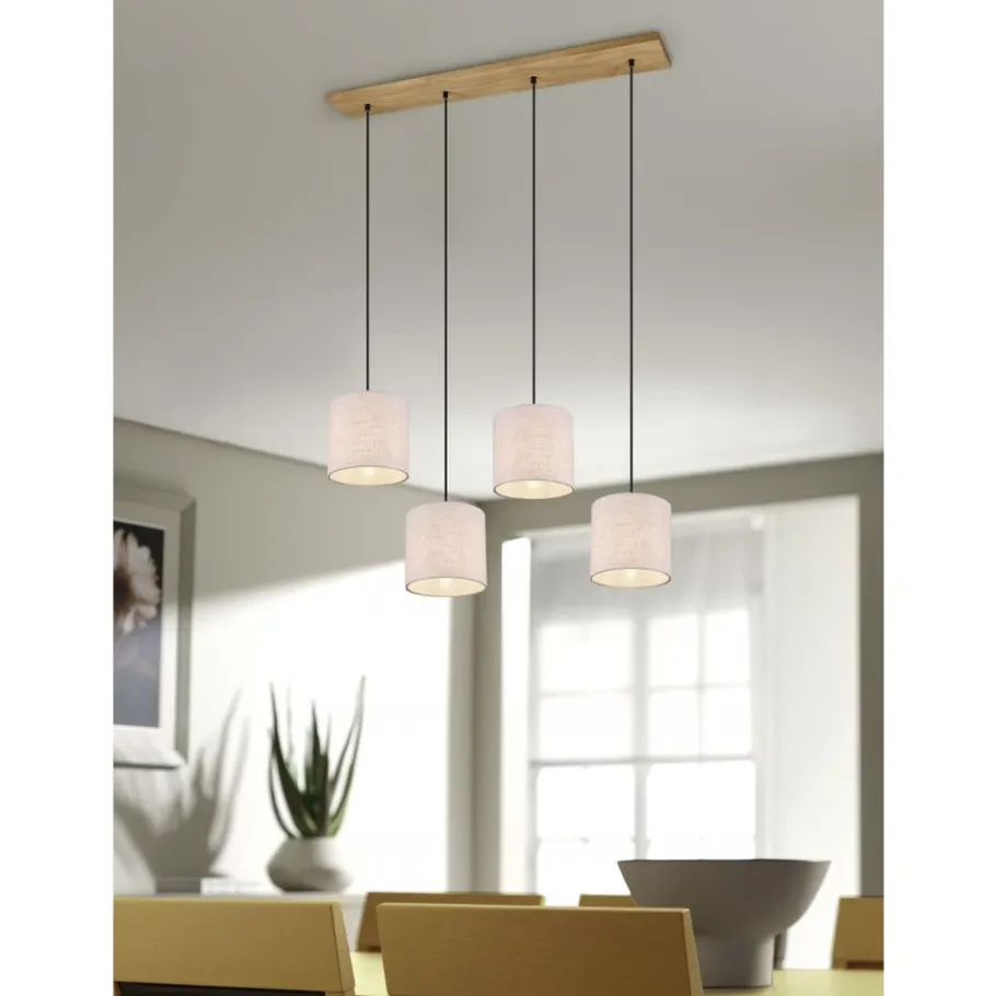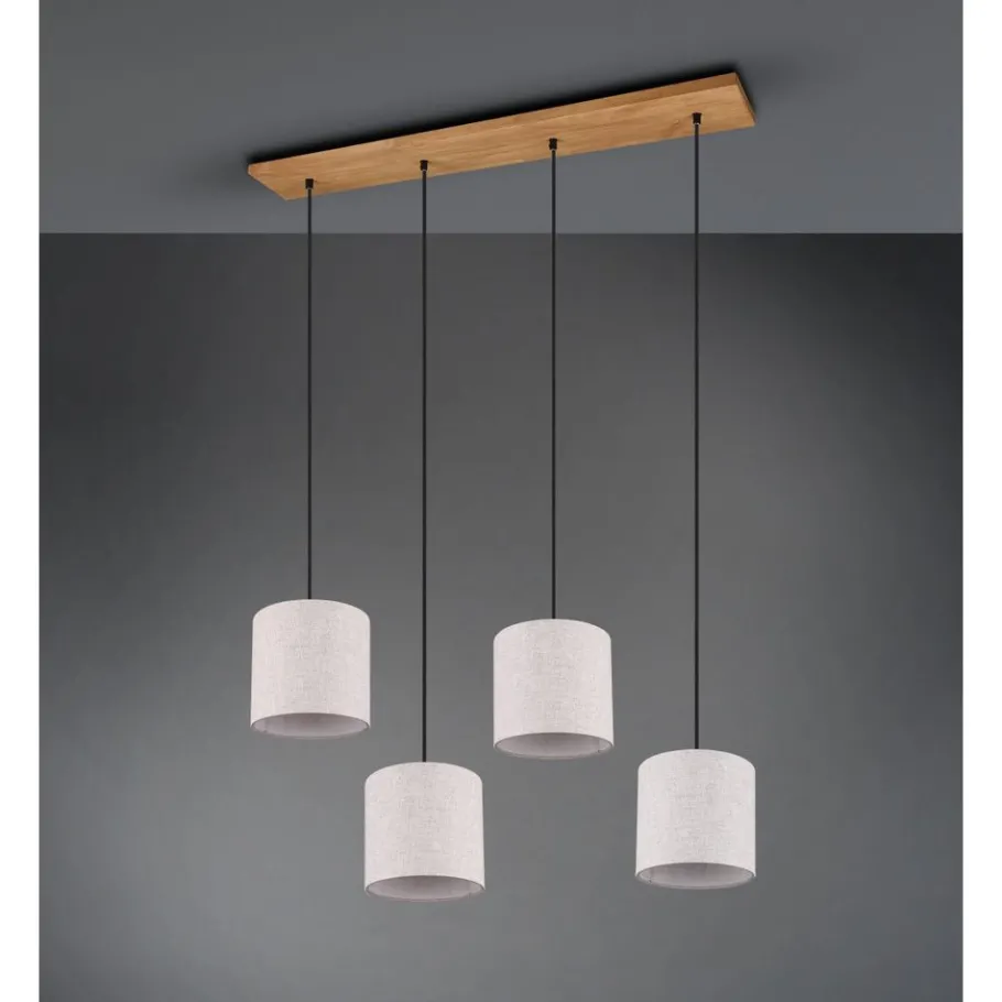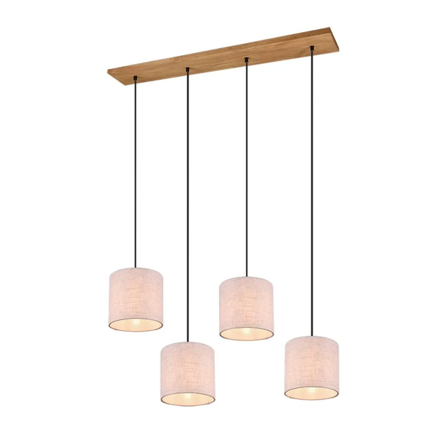 Natuurlijke materialen, zoals hout en stof, werken uitnodigend en creëren een behaaglijke sfeer. De lampen van de serie ELMAU brengen een gezellige charme en een aangename lichtstemming uw huis binnen. Op de gang of in de woon- of slaapkamer, die lamp biedt veelzijdige toepassingsgebieden. De viervlammige hanglamp heeft een maximale hanglengte van 150 cm. De aparte lampenkappen hebben een diameter van 35 cm en de hoogte ervan kan individueel afgesteld worden. Het lichte design uit hout en beige stof laat zich gemakkelijk combineren met verschillende kleur- en inrichtingsconcepten. Voor een energiebesparende verlichting is het gebruik van een ledlichtbron aanbevolen. Deze zijn een optimaal alternatief voor gewone halogeenlampen en staan voor een hoge lichtkwaliteit en een energiebesparing van tot 80%. Bovendien profiteert u bij ledlichtbronnen van een lange levensduur, een geringe warmteontwikkeling en spaart tegelijkertijd het milieu.
