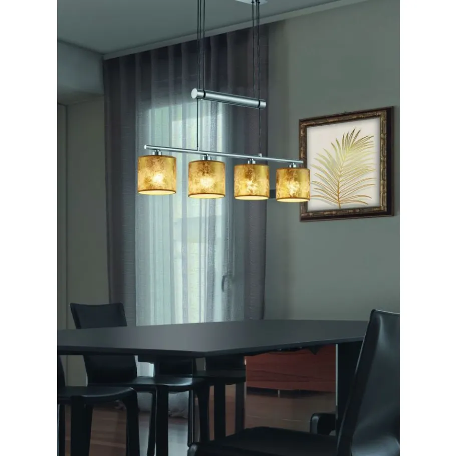 Een absolute alledaagse held en toch een decoratief woonaccessoire. De vier-lichts GARDA hanglamp kan in hoogte worden versteld naargelang je behoeften en omstandigheden. Zo kan ze boven elke eettafel worden geplaatst voor een optimale verlichting. De ophanglengte kan worden gevarieerd tussen 95 cm en 150 cm. Ze heeft een breedte van 77 cm en een diepte van 13,5 cm. Het metalen frame in mat nikkel en de stoffen kappen in goud harmoniëren bijzonder goed met elkaar en passen bij een stijlvolle inrichtingsstijl. Voor een energiebesparende verlichting is het gebruik van een ledlichtbron aanbevolen. Deze zijn een optimaal alternatief voor gewone halogeenlampen en staan voor een hoge lichtkwaliteit en een energiebesparing van tot 80%. Bovendien profiteert u bij ledlichtbronnen van een lange levensduur, een geringe warmteontwikkeling en spaart tegelijkertijd het milieu.