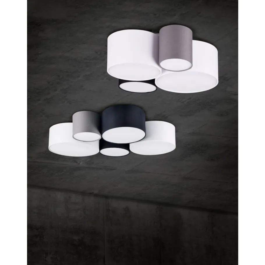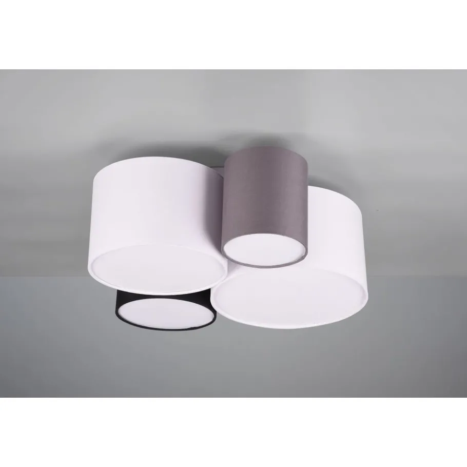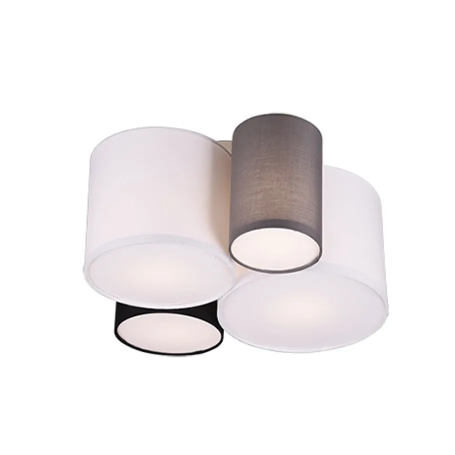 toffen lampen creëren een gezellige sfeer en worden beschouwd als een klassieker in decoratieve verlichting. De vierlichts HOTEL plafondlamp is bijzonder effectief in woon- en slaapgedeeltes. Ze zorgt voor harmonieuze lichtaccenten en geeft je huis een gezellige sfeer. Twee witte, een zwarte en een grijze stoffen kap vormen samen een harmonieuze combinatie die op verschillende manieren kan worden gebruikt. Voor een energiebesparende verlichting is het gebruik van een ledlichtbron aanbevolen. Deze zijn een optimaal alternatief voor gewone halogeenlampen en staan voor een hoge lichtkwaliteit en een energiebesparing van tot 80%. Bovendien profiteert u bij ledlichtbronnen van een lange levensduur, een geringe warmteontwikkeling en spaart tegelijkertijd het milieu.