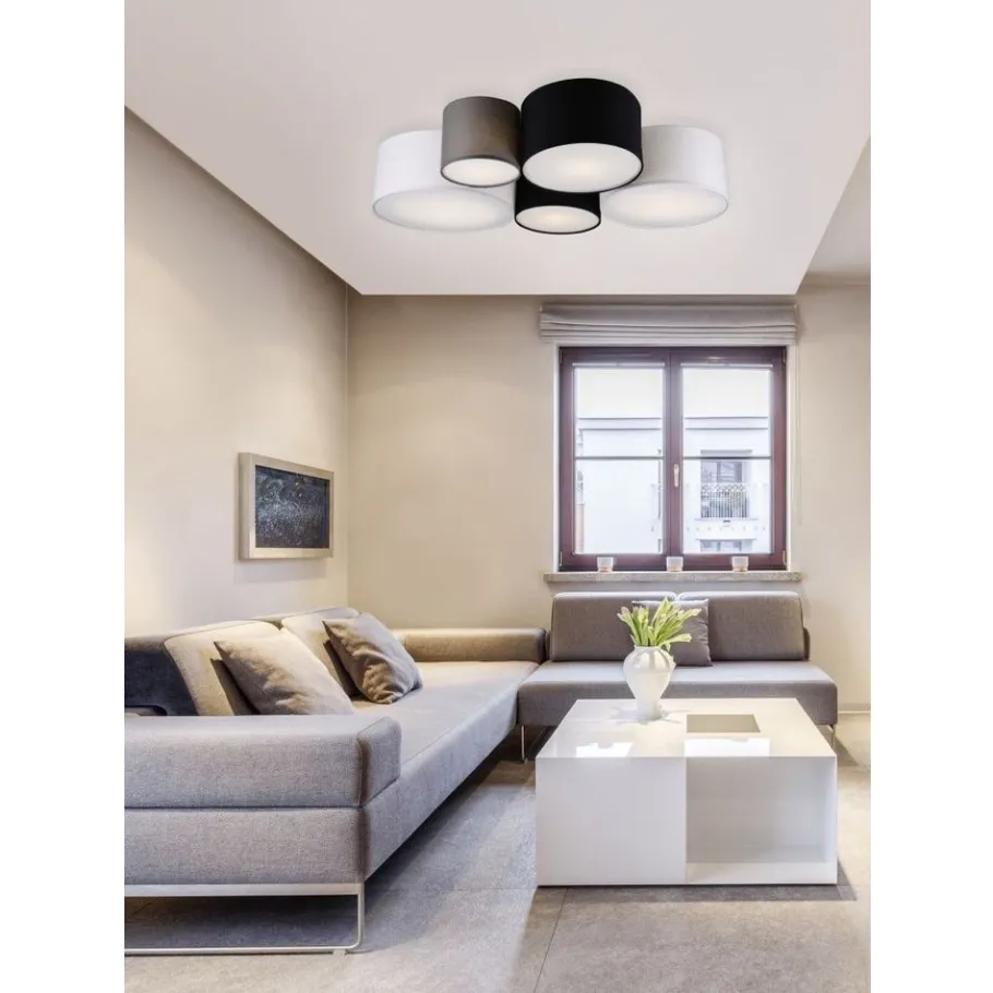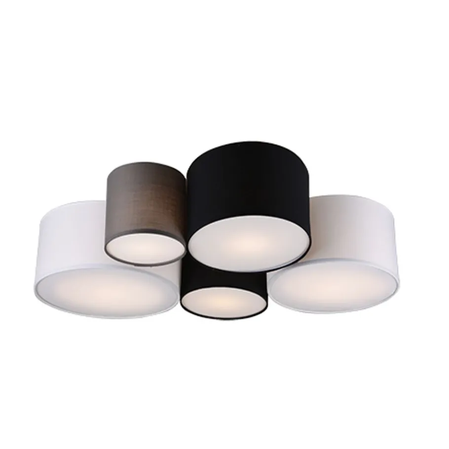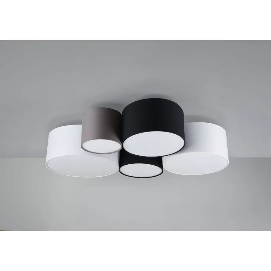 Stoffen lampen creëren een gezellige sfeer en worden beschouwd als een klassieker in decoratieve verlichting. De vijf-lichts plafondlamp is bijzonder effectief in woon- en slaapgedeeltes. Ze zorgt voor harmonieuze lichtaccenten en geeft je huis een gezellige sfeer. Twee witte, twee zwarte en een grijze stoffen kap vormen samen een harmonische combinatie die veelzijdig kan worden gebruikt. Voor een energiebesparende verlichting is het gebruik van een ledlichtbron aanbevolen. Deze zijn een optimaal alternatief voor gewone halogeenlampen en staan voor een hoge lichtkwaliteit en een energiebesparing van tot 80%. Bovendien profiteert u bij ledlichtbronnen van een lange levensduur, een geringe warmteontwikkeling en spaart tegelijkertijd het milieu.