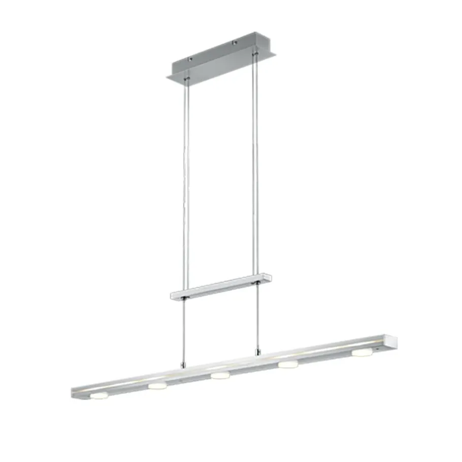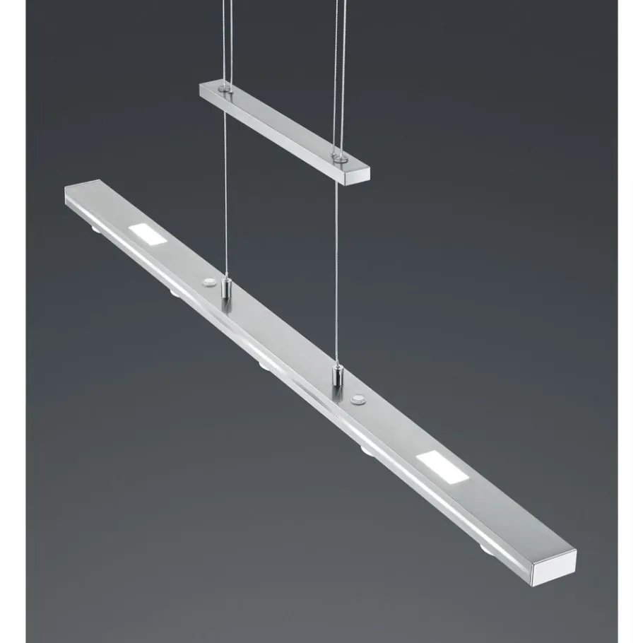 De hanglamp LACAL overtuigt door haar tijdloze look en een rechtlijnige vormgeving. Naast het stijlvolle uitzicht kan de lamp ook overtuigen met haar technische hoogtepunten: door middel van twee toetsen op de bovenkant van de lamp kunnen de helderheid en lichtkleur onafhankelijk van elkaar bestuurd worden. Kies uit drie helderheidsniveaus de juiste sfeer voor uw behoeften. De LACAL laat zich perfect boven de eettaffel plaatsen en kan door het strakke design uitstekend in verschillende inrichtingsstijlen geïntegreerd worden. Van de zeven lichtbronnen zijn er vijf ronde te vinden aan de onderkant van de lamp en twee rechthoekige aan de bovenkant. De hoogte van de hanglamp kan tussen 95 en 160 cm individueel versteld worden. De armatuur in mat nikkel ziet er elegant uit en zorgt voor een harmonieus totaalbeeld en gerichte verlichting dankzij de opwaartse en neerwaartse lichtemissie. Daarnaast beschikt de lamp over een moderne ledtechnologie die zich onderscheidt met een hoge lichtkwaliteit en energie-efficiëntie. In vergelijking met gewone halogeenlampen kan tot 80% bespaard worden op de energiekosten. Bovendien hebben ledlampen een lange levensduur, produceren minder warmte en zijn milieuvriendelijk.