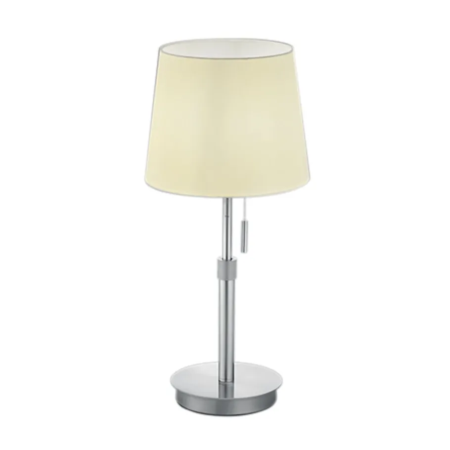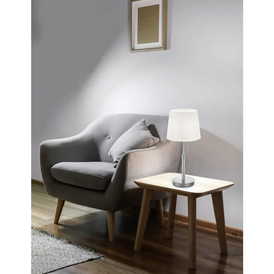 Eenvoudig, elegant en designgericht. De hoogwaardige tafellamp LYON maakt indruk met haar moderne stijl en ongecompliceerde ontwerp. De tafellamp roept een aangename lichtstemming op en is tegelijkertijd ongelooflijk decoratief. De hoogte van de lamp kan worden ingesteld tussen 45 en 56,5 cm, waardoor hij ongelooflijk flexibel te gebruiken en te plaatsen is. Als bedlamp in de slaapkamer, op een ladekast of op een bijzettafel in de woonkamer, de lamp is ook overdag een echt sieraad. De combinatie van geborsteld en glanzend nikkel wordt afgerond door een witte stoffen kap, waardoor een geraffineerd totaalbeeld ontstaat. Voor een energiebesparende verlichting is het gebruik van een ledlichtbron aanbevolen. Deze zijn een optimaal alternatief voor gewone halogeenlampen en staan voor een hoge lichtkwaliteit en een energiebesparing van tot 80%. Bovendien profiteert u bij ledlichtbronnen van een lange levensduur, een geringe warmteontwikkeling en spaart tegelijkertijd het milieu.