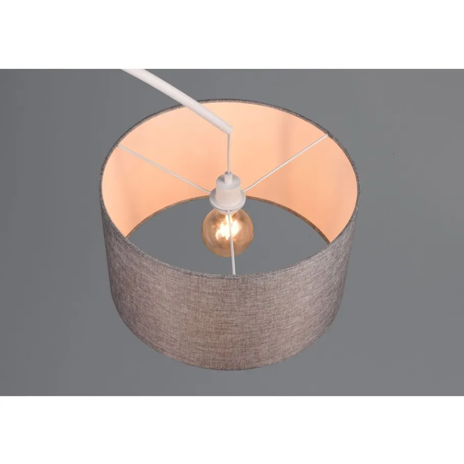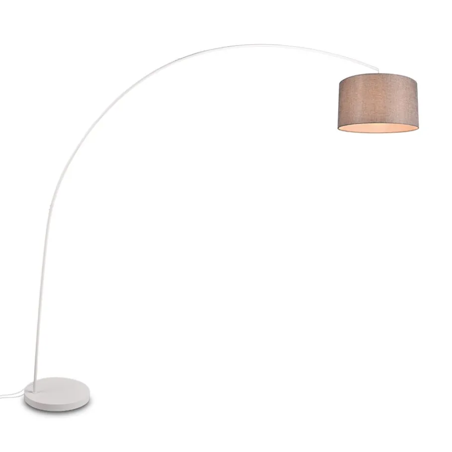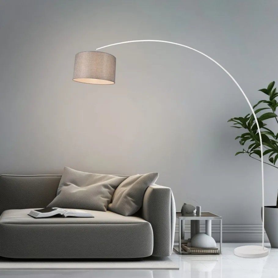 Gebogen armaturen geven je huis een modern tintje en stralen tegelijkertijd een aangenaam gevoel van rust uit. Dit is ook het geval met de MANSUR vloerlamp, die een warme sfeer creëert met zijn slanke, gebogen frame en eenvoudige kapvorm. De klassieke stoffen kap richt het licht naar boven en naar beneden en creëert daaronder een prachtig lichteiland waar je kunt lezen of ontspannen. De MANSUR is bijzonder geschikt voor grote woonkamers, omdat hij veel ruimte inneemt en effectief is als decoratief element op zich. De stoffen kap is grijs en wordt gecompleteerd door een frame en voet in mat wit. Het gebruik van LED lichtbronnen wordt aanbevolen voor energiebesparende verlichting. Deze vormen een ideaal alternatief voor conventionele halogeenlichtbronnen en bieden een hoge lichtkwaliteit en energiebesparingen tot 80%. Met LED lichtbronnen profiteert u ook van een lange levensduur en een lage warmteontwikkeling, terwijl het milieu wordt beschermd.