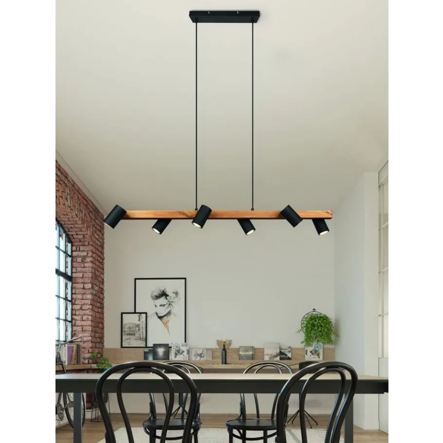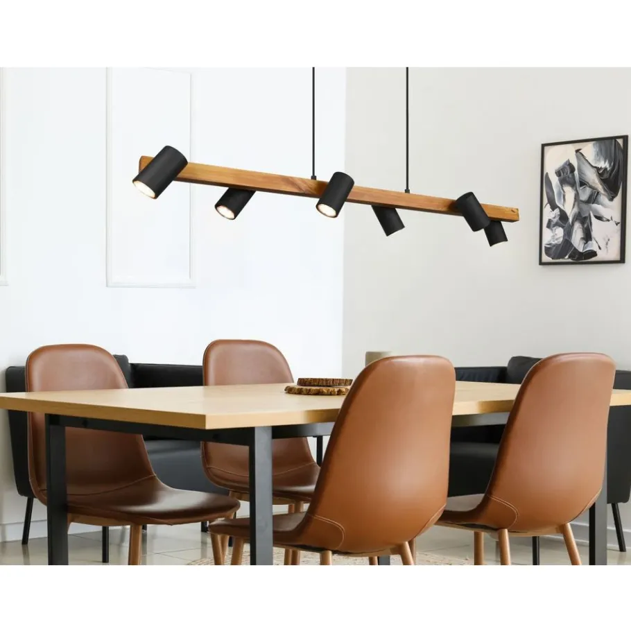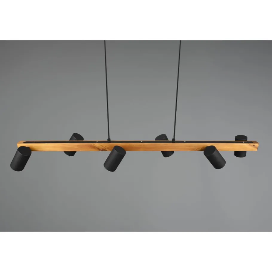 De hanglamp MARLEY is niet alleen praktisch in vorm en functie, maar vooral één ding: gewoonweg mooi! De lamp heeft een discreet design en overtuigt door haar hoogwaardige afwerking. In de keuken of in de woonzone: de zesvlammige MARLEY kan veelzijdig gebruikt worden en laat zich goed combineren met verschillende inrichtingsstijlen. De slinger is ontworpen in de kleur mat zwart en hout en kan daardoor moderne kleurconcepten stijlvol aanvullen en vervolledigen. Voor een energiebesparende verlichting is het gebruik van een ledlichtbron aanbevolen. Deze zijn een optimaal alternatief voor gewone halogeenlampen en staan voor een hoge lichtkwaliteit en een energiebesparing van tot 80%. Bovendien profiteert u bij ledlichtbronnen van een lange levensduur, een geringe warmteontwikkeling en spaart tegelijkertijd het milieu.