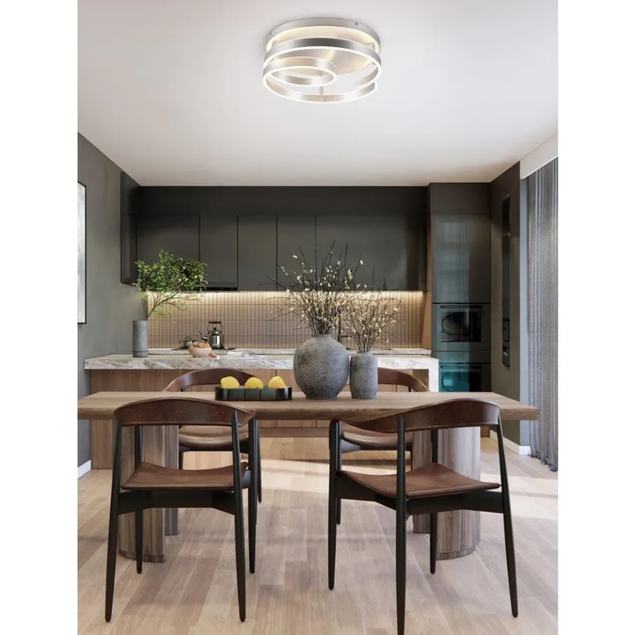 De plafondlamp MARNIE speelt met haar gebogen vorm en maakt een sterk statement. De spiraalvormige armatuur maakt een grote impact in de eetkamer of woonkamer boven een tafel. De indirecte verlichting verrijkt je woonruimte met een aangename lichtsfeer. Dankzij de SWITCH dimmer kan het licht trapsgewijs (100%, 50% en 25%) worden gedimd met een conventionele lichtschakelaar. Creëer een bijzonder middelpunt in je leefruimte! De speciale designtaal en de kleur van geborsteld aluminium zetten moderne accenten in je interieur. De armatuur is ook voorzien van moderne LED-technologie, die wordt gekenmerkt door een hoge lichtkwaliteit en energie-efficiëntie. Vergeleken met conventionele halogeenlichtbronnen kan tot 80% op de energiekosten worden bespaard. Met LED lichtbronnen profiteert u ook van een lange levensduur en een lage warmteontwikkeling, terwijl het milieu wordt beschermd.