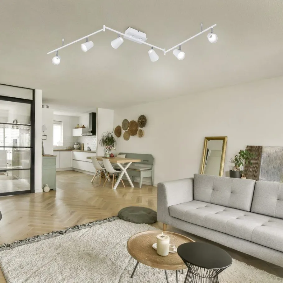 Deze zes-lichts NARCOS plafondlamp maakt indruk met haar tijdloze design en is een hoogtepunt in elk modern interieur. De zes spots kunnen worden uitgelijnd en gedraaid in verschillende hoeken dankzij een geïntegreerd scharnier. Zo krijg je een plafondlamp die je kunt aanpassen aan je persoonlijke wensen, waarmee je indirecte verlichting kunt creëren of een hoek van een kamer of een object in de kamer kunt verlichten en uitlichten. De lamp heeft een lengte van 177 cm. Het klassieke ontwerp en de veelzijdige matwitte kleur creëren een stijlvolle flair in je huis en verwennen je met effectief licht. Daarnaast beschikt de lamp over een moderne ledtechnologie die zich onderscheidt met een hoge lichtkwaliteit en energie-efficiëntie. In vergelijking met gewone halogeenlampen kan tot 80% bespaard worden op de energiekosten. Bovendien hebben ledlampen een lange levensduur, produceren minder warmte en zijn milieuvriendelijk.
