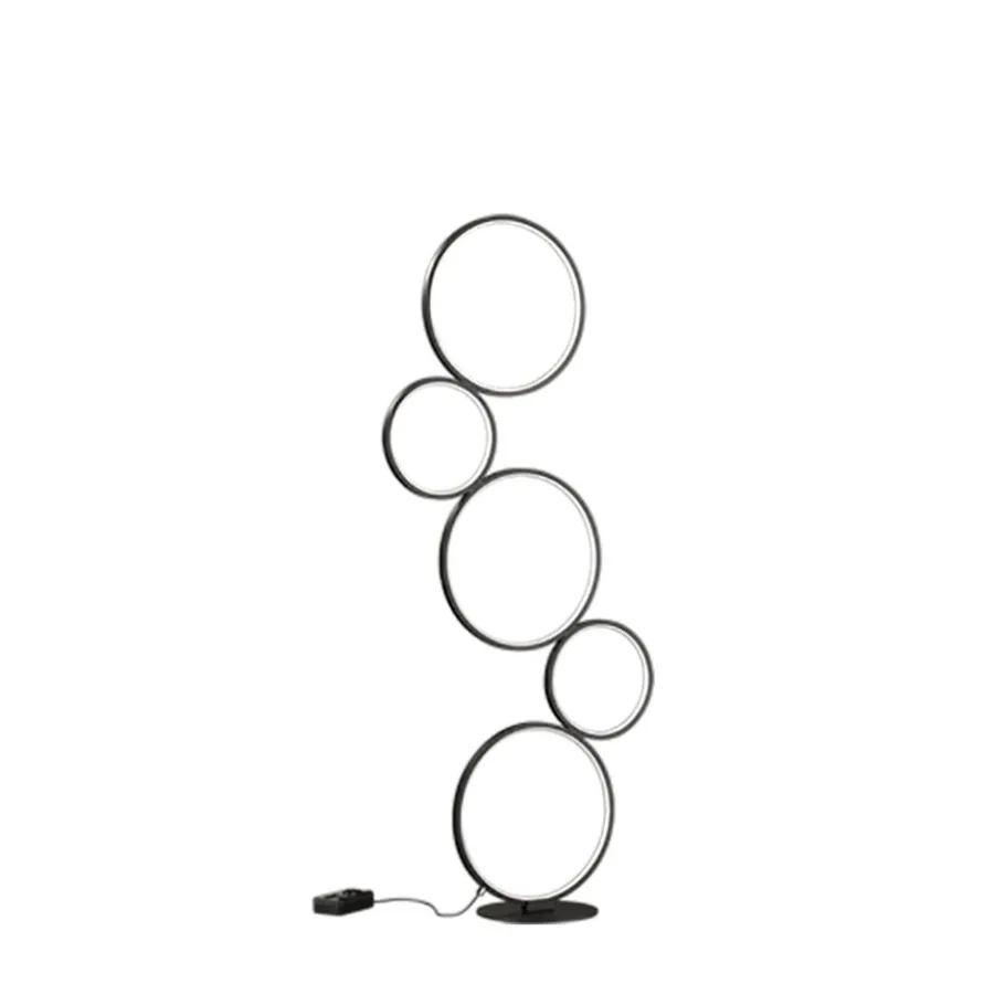 Met zijn vijf gestapelde ringen van verschillende diameters is de RONDO vloerlamp een echte blikvanger. De vloerlamp heeft een geïntegreerde dimmer die wordt bediend via de snoerschakelaar. Hiermee kun je flexibel de helderheid regelen van de LED’s die aan de binnenkant van elke cirkel zijn geïnstalleerd. De 115 cm hoge vloerlamp is een echt decoratief element en verfraait stijlvol elke woonruimte. Dankzij de mat zwarte kleur kan de lamp met vele inrichtingsstijlen gecombineerd worden. Daarnaast beschikt de lamp over een moderne ledtechnologie die zich onderscheidt met een hoge lichtkwaliteit en energie-efficiëntie. In vergelijking met gewone halogeenlampen kan tot 80% bespaard worden op de energiekosten. Bovendien hebben ledlampen een lange levensduur, produceren minder warmte en zijn milieuvriendelijk.