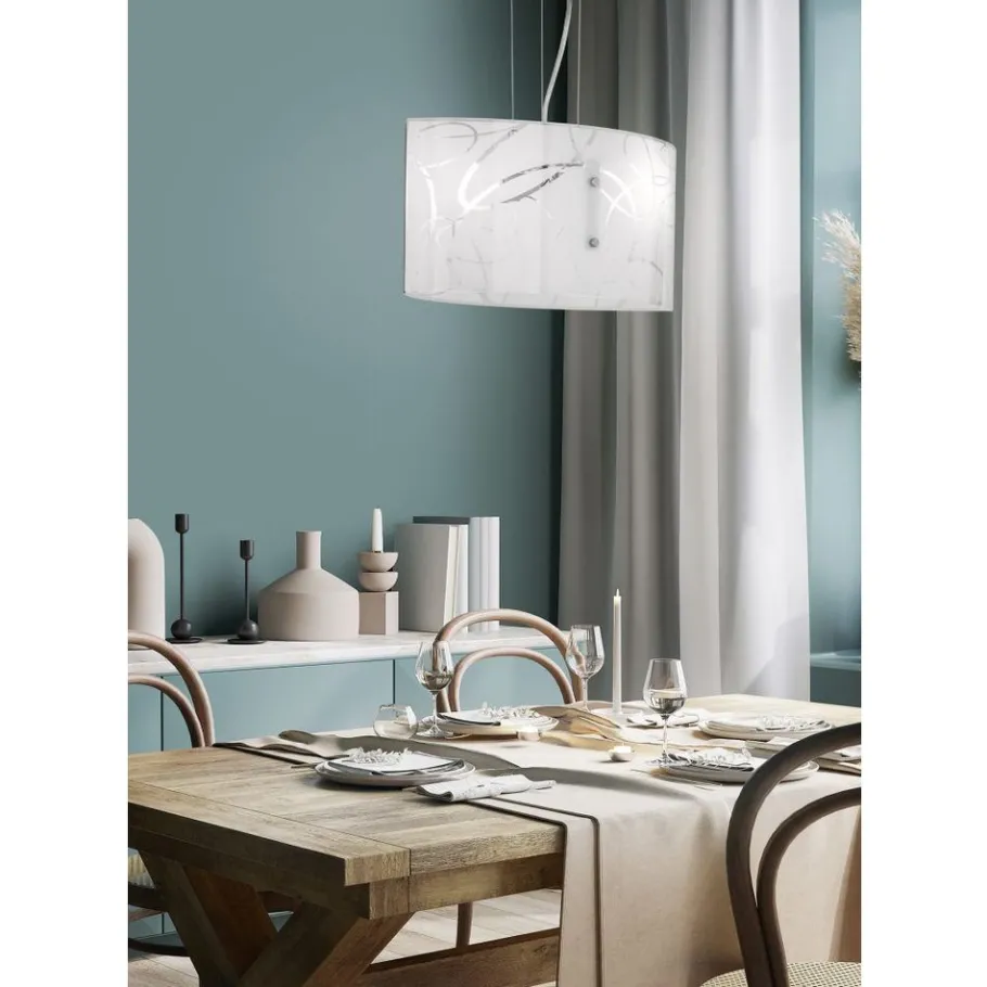 De SPIRELLI hanglamp maakt indruk met haar klassieke en tijdloze elegantie. Het gesatineerde glas met helder decor straalt niet alleen een lichtkegel naar beneden uit, maar ook een zacht licht van opzij, dat de omgeving vult met kleine lichtaccenten. De hanglamp creëert zo een harmonieuze sfeer in je woon- en eetkamer. De neutrale kleurstelling past perfect bij vrijwel alle klassieke tot moderne inrichtingsstijlen. De hanglamp meet 40cm x 20cm en kan worden gemonteerd tot een maximale ophanglengte van 150cm. In de twee E27-fittingen passen standaard lichtbronnen van maximaal 40 watt.