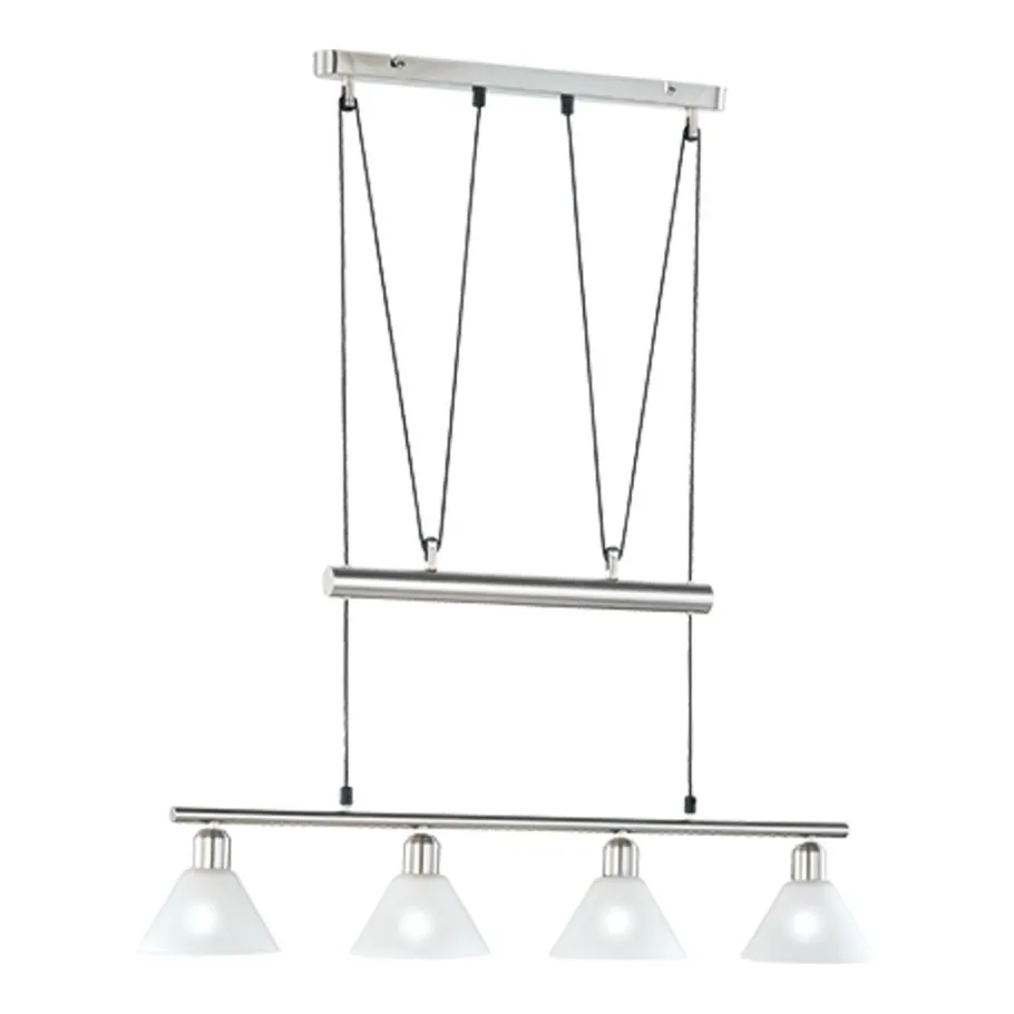 De in hoogte verstelbare STAMINA lamp zorgt met zijn licht voor een aangename verlichting in je woonruimte en is bijzonder geschikt voor gebruik boven de eettafel of iets dergelijks. De breedte is 80cm en de hoogte is verstelbaar van 80 tot 180cm. Het aantrekkelijke silhouet samen met het frame in mat nikkel en de glazen lampenkappen in opaalwit creëren een elegante look. Voor een energiebesparende verlichting is het gebruik van een ledlichtbron aanbevolen. Deze zijn een optimaal alternatief voor gewone halogeenlampen en staan voor een hoge lichtkwaliteit en een energiebesparing van tot 80%. Bovendien profiteert u bij ledlichtbronnen van een lange levensduur, een geringe warmteontwikkeling en spaart tegelijkertijd het milieu.