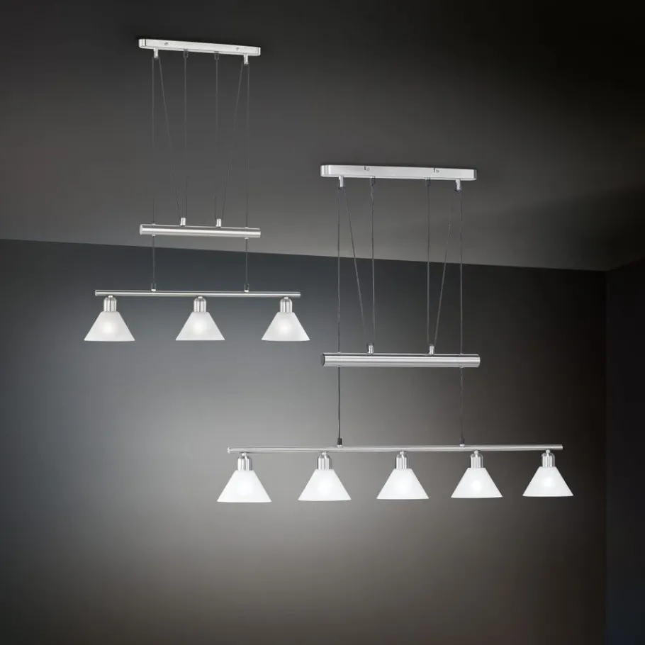 De in hoogte verstelbare STAMINA lamp zorgt met zijn licht voor een aangename verlichting in je woonruimte en is bijzonder geschikt voor gebruik boven de eettafel of iets dergelijks. De breedte is 102cm en de hoogte is verstelbaar van 80 tot 180cm. Het aantrekkelijke silhouet samen met het frame in mat nikkel en de glazen lampenkappen in opaalwit creëren een elegante look. Voor een energiebesparende verlichting is het gebruik van een ledlichtbron aanbevolen. Deze zijn een optimaal alternatief voor gewone halogeenlampen en staan voor een hoge lichtkwaliteit en een energiebesparing van tot 80%. Bovendien profiteert u bij ledlichtbronnen van een lange levensduur, een geringe warmteontwikkeling en spaart tegelijkertijd het milieu.