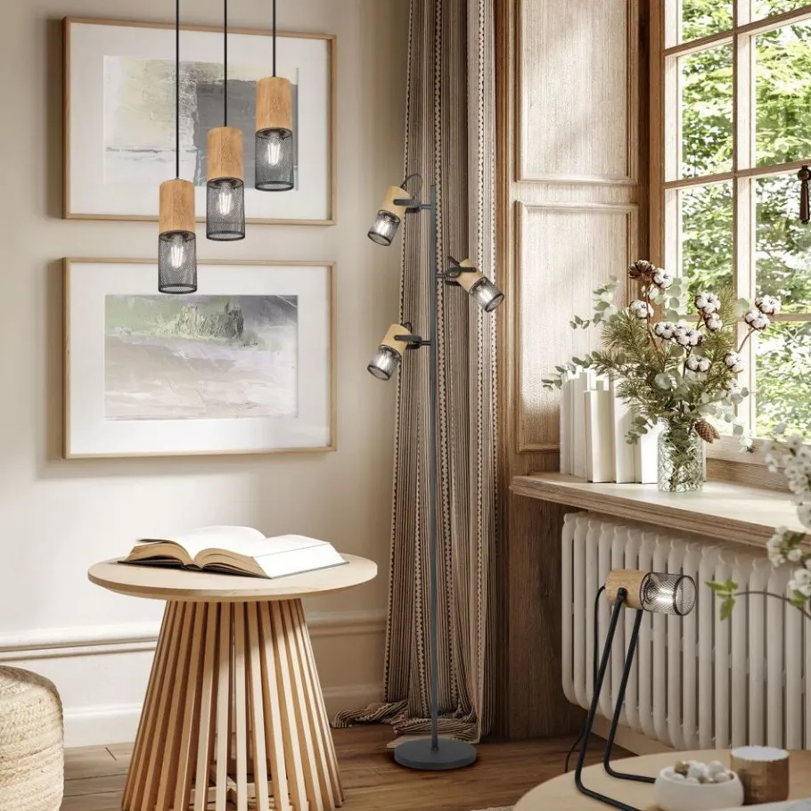 De moderne mix uit metaal en hout werkt tijdloos en is absoluut trendy. De combinatie met natuurlijke materialen is niet meer weg te denken uit moderne woonruimtes en zorgt bovendien voor een gezellige woonsfeer. De staande lamp TOSH is dus een ideale keuze voor de juiste lichtstemming en kan donkere hoekjes opnieuw doen stralen. De drie lichtbronnen kunnen daarvoor individueel gericht worden. De lamp kan gemakkelijk in- en uitgeschakeld worden via een voetschakelaar. Metaal in mat zwart en houtelementen komen voor in moderne en minimalistische inrichtingsstijlen. Voor een energiebesparende verlichting is het gebruik van een ledlichtbron aanbevolen. Deze zijn een optimaal alternatief voor gewone halogeenlampen en staan voor een hoge lichtkwaliteit en een energiebesparing van tot 80%. Bovendien profiteert u bij ledlichtbronnen van een lange levensduur, een geringe warmteontwikkeling en spaart tegelijkertijd het milieu.