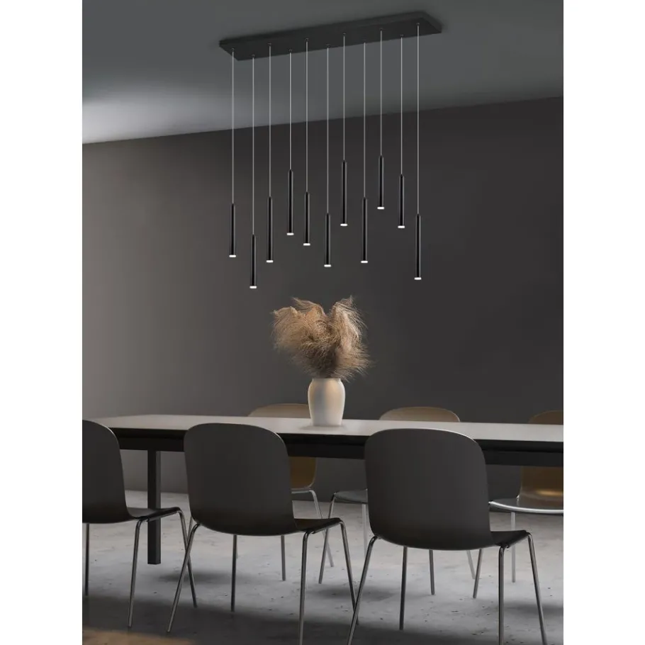 Het stijlvolle design van de hanglamp maakt van de TUBULAR een absolute blikvanger. Als doelgerichte verlichting boven de eettafel komt de lamp bijzonder goed tot uiting en zorgt voor optimale lichtomstandigheden. Via een geïntegreerde SWITCH-dimmer kan de helderheid in niveaus afgestemd worden van 100% naar 50% en 25% door middel van een gewone lichtschakelaar. De 11-vlammige hanglamp heeft een maximale hoogte van 150 cm. De lichtbronnen hebben een variabele lengte van 22 tot 36 cm en kunnen onafhankelijk van elkaar ingekort worden, zodat er een individueel uitzicht ontstaat. De hanglamp in mat zwart laat zich uitstekend integreren in moderne woonruimtes en zorgt voor een aangename sfeer. Daarnaast beschikt de lamp over een moderne ledtechnologie die zich onderscheidt met een hoge lichtkwaliteit en energie-efficiëntie. In vergelijking met gewone halogeenlampen kan tot 80% bespaard worden op de energiekosten. Bovendien hebben ledlampen een lange levensduur, produceren minder warmte en zijn milieuvriendelijk.