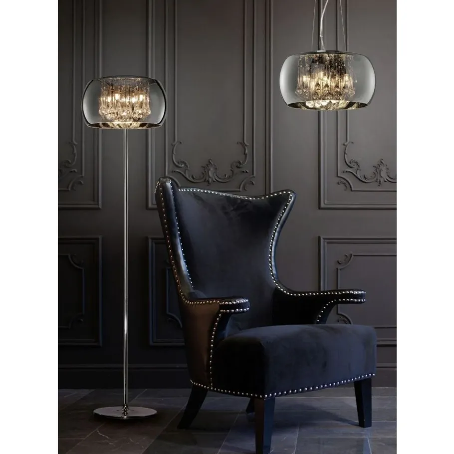 Karakteristieke armaturen zoals die in de VAPORE-serie geven een ruimte elegantie en individuele charme. In onverlichte toestand staat de verchroomde glazen kap in het middelpunt, maar zodra de VAPORE lamp wordt ingeschakeld, straalt hij in nieuwe pracht. Als de lamp aangaat, wordt het anders gespiegelde glas transparant en worden de geïntegreerde glazen druppels zichtbaar. Het contrast van materiaal, kleur en speelse details maakt het armatuur uniek en geeft de ruimte een warme en mysterieuze sfeer. De hanglamp heeft een diameter van 40 cm en een maximale ophanglengte van 150 cm, die tijdens de installatie kan worden gespecificeerd. De vijf G9 lampen geven elk 624 lumen af bij 42 watt en een warmwitte lichtkleur van 2800 Kelvin.