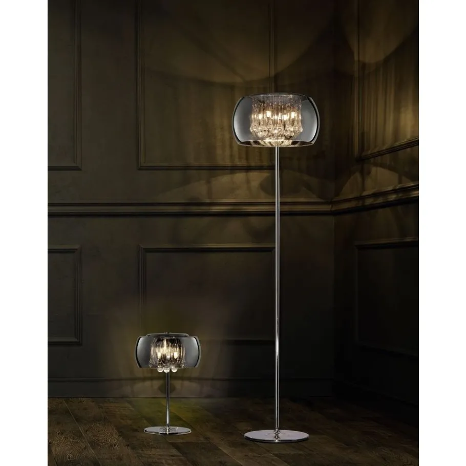 Karakteristieke armaturen zoals die in de VAPORE-serie geven een ruimte elegantie en individuele charme. In onverlichte toestand staat de verchroomde glazen kap in het middelpunt, maar zodra de VAPORE lamp wordt ingeschakeld, straalt hij in nieuwe pracht. Als de lamp aangaat, wordt het anders gespiegelde glas transparant en worden de geïntegreerde glazen druppels zichtbaar. Het contrast van materiaal, kleur en speelse details maakt de lamp uniek en geeft de kamer een warme en mysterieuze sfeer. De tafellamp heeft een hoogte van 43 cm en een diameter van 28 cm. De drie G9 lampen geven elk 624 lumen af bij 42 watt en een warmwitte lichtkleur van 2800 Kelvin.