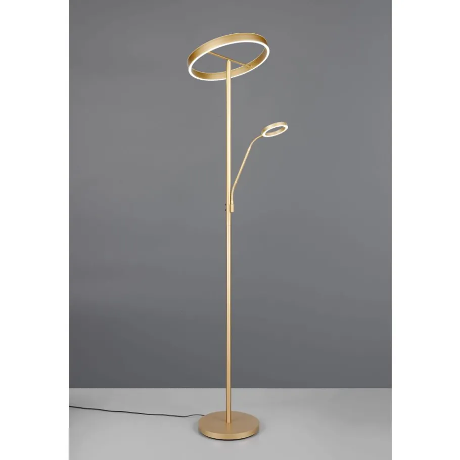 De WILLIS vloerlamp maakt indruk met zijn elegante ontwerp en verfijnde functionaliteit. De ringvormige lampkop en de flexibele leesarm bieden een breed scala aan verlichtingsopties die kunnen worden aangepast aan individuele behoeften. Beide lichtbronnen kunnen apart worden geschakeld, terwijl de lichtkleur en helderheid individueel kunnen worden aangepast. Dit maakt precieze controle over de verlichting mogelijk, of het nu voor gezellige avonden op de bank is of als discrete achtergrondverlichting. De moderne look in goudkleur geeft de lamp een tijdloze uitstraling die moeiteloos past bij verschillende inrichtingsstijlen. De armatuur is ook voorzien van moderne LED-technologie, die wordt gekenmerkt door een hoge lichtkwaliteit en energie-efficiëntie. Vergeleken met conventionele halogeenlichtbronnen kan tot 80% op de energiekosten worden bespaard. LED lichtbronnen hebben ook een lange levensduur, produceren minder warmte en beschermen het milieu.